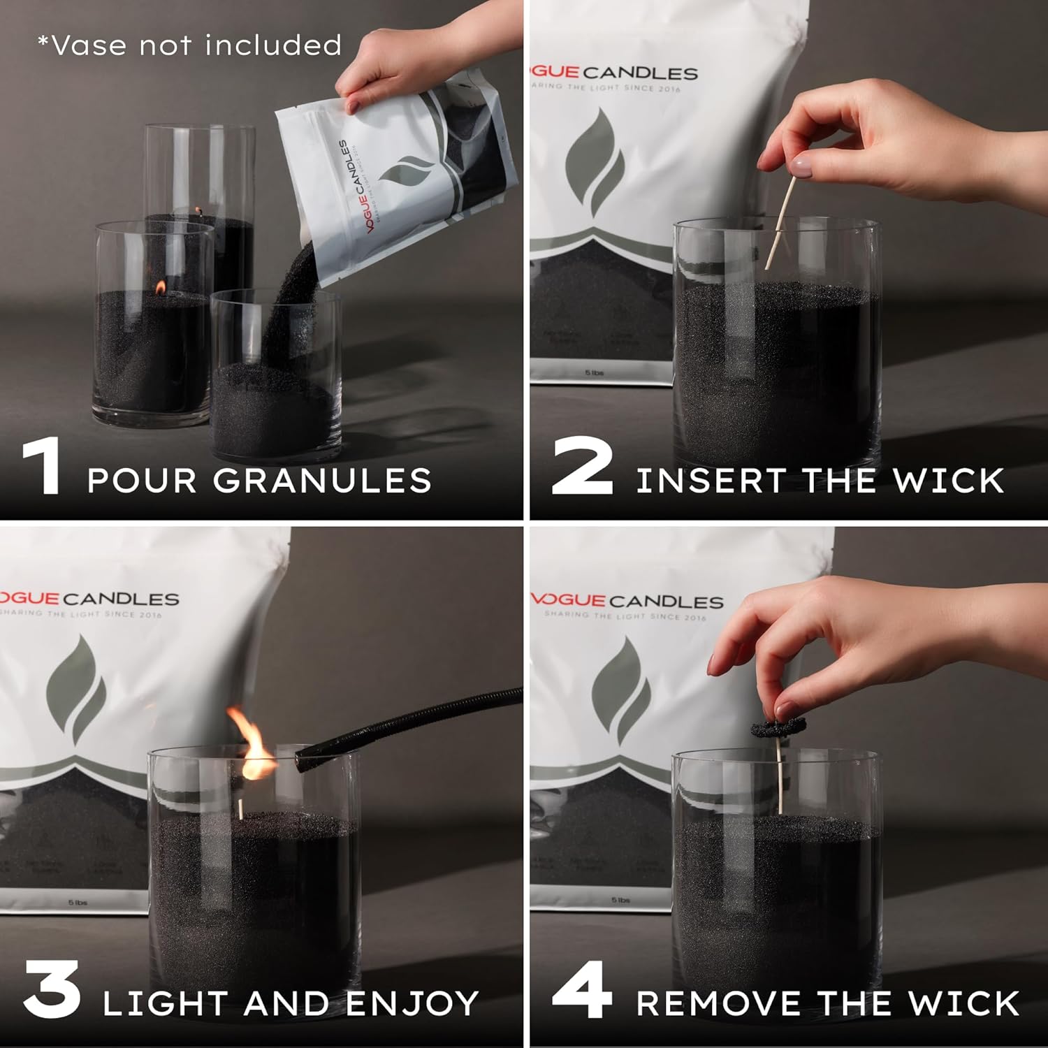 - Create a Candle, Your Way. No Mold, No Mess: Our signature plant based granules turn any vase or vessel into a stunning candle. Each 1LB kit includes 15 clean-burning cotton wicks. Each 5LB kit includes 50 wicks for extended use or gifting. Just pour to 2/3 full, insert a wick vertically, and light. No wax pouring or molds required. Every setup is unique, every candle is yours.