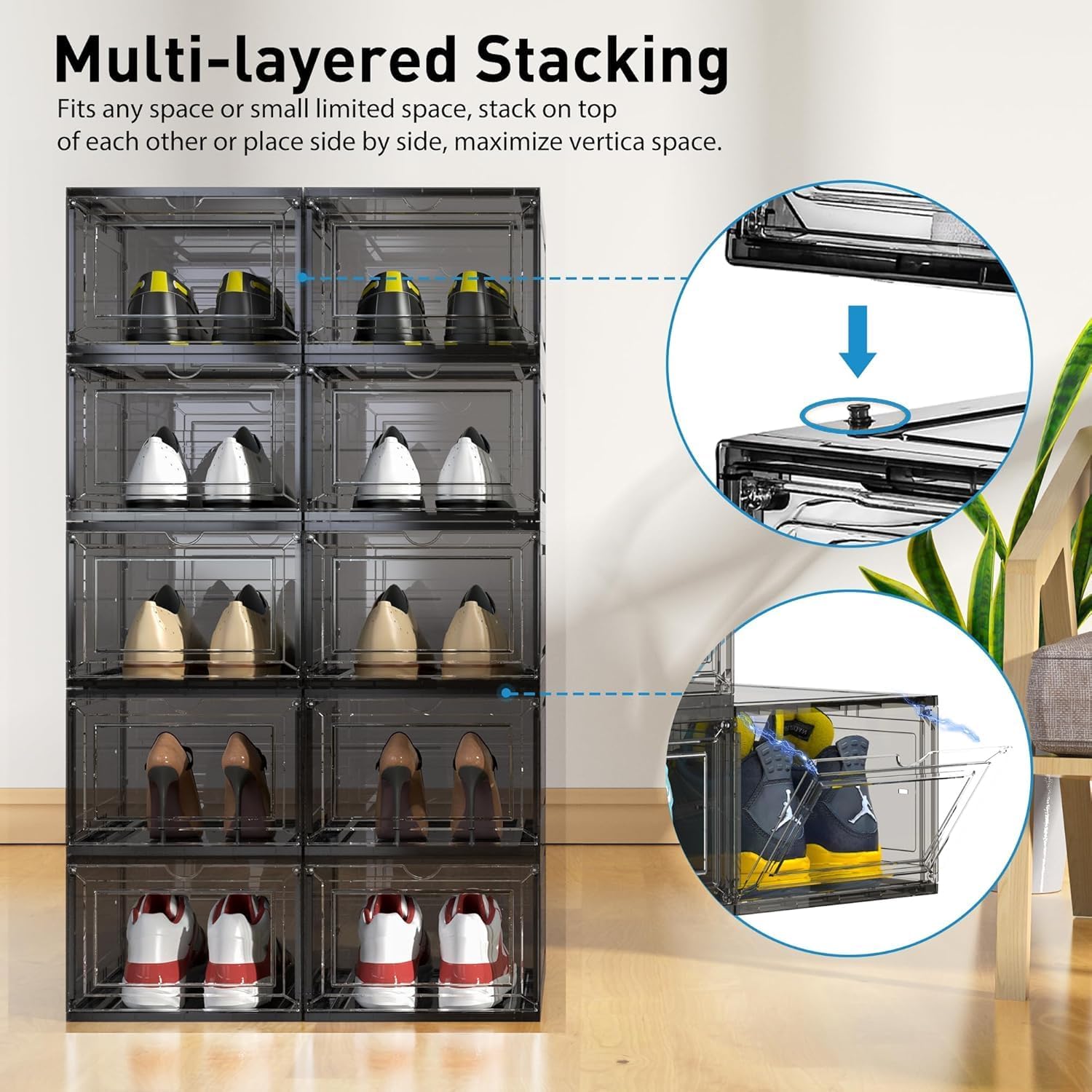 • High-Quality Hard Shoe Box:Our shoe organizer are made of sturdy hard plastic, with excellent durability and load-bearing capacity. The transparent acrylic magnetic door opens and closes smoothly. Elevate your shoe storage experience with our transparent, sturdy shoe boxes.