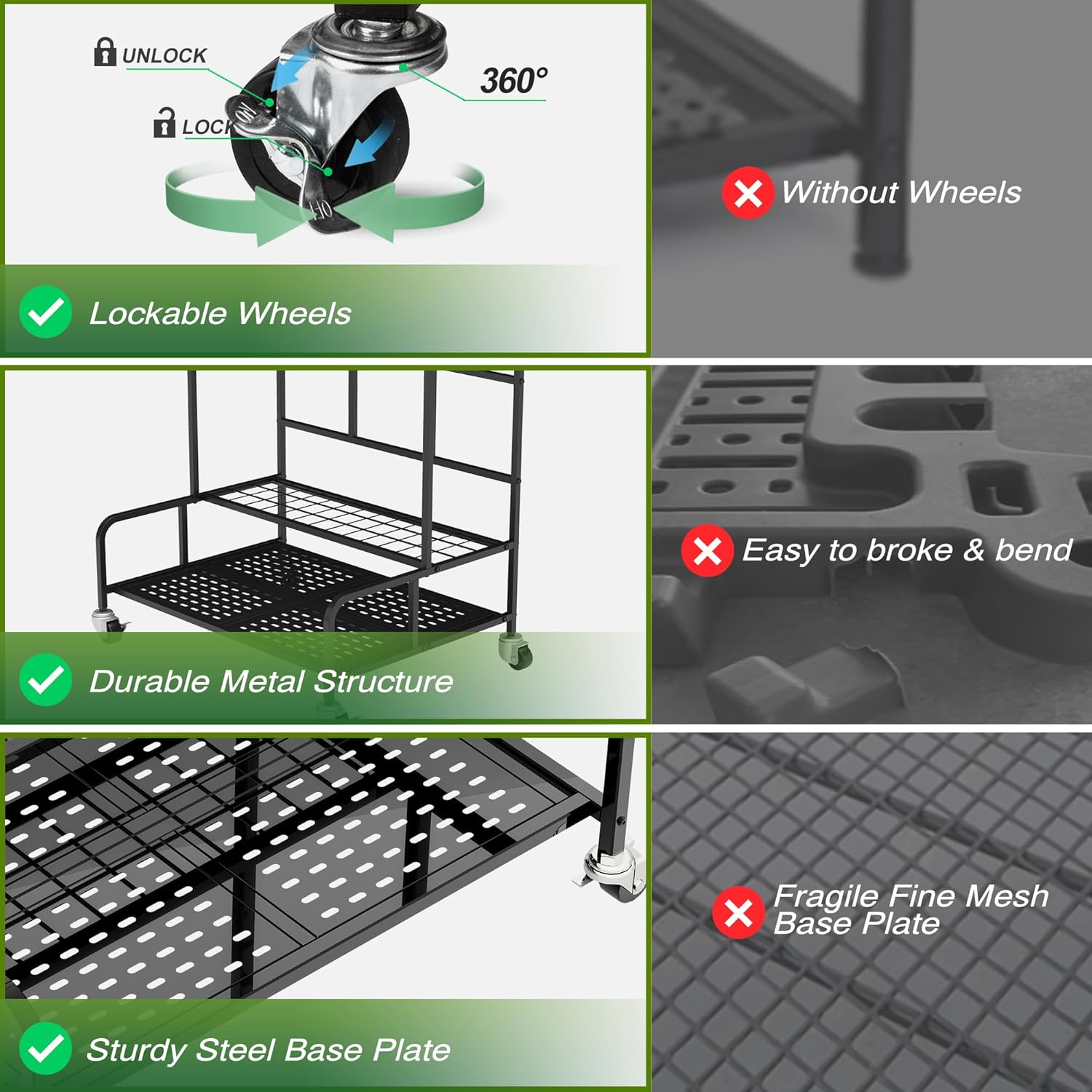 - Easy to Move and Assemble:Four lockable wheels for easy mobility,move the rack effortlessly and fix it in place when needed during use. Easily reposition for cleaning or reorganization. Beyond being easy to move, this garden tool stand prides itself on an uncomplicated assembly process. Accompanied by screws and wrenches, setting it up is a breeze. The provided instruction manual offers clear, step-by-step guidance, enabling you to put it together within minutes without breaking a sweat.