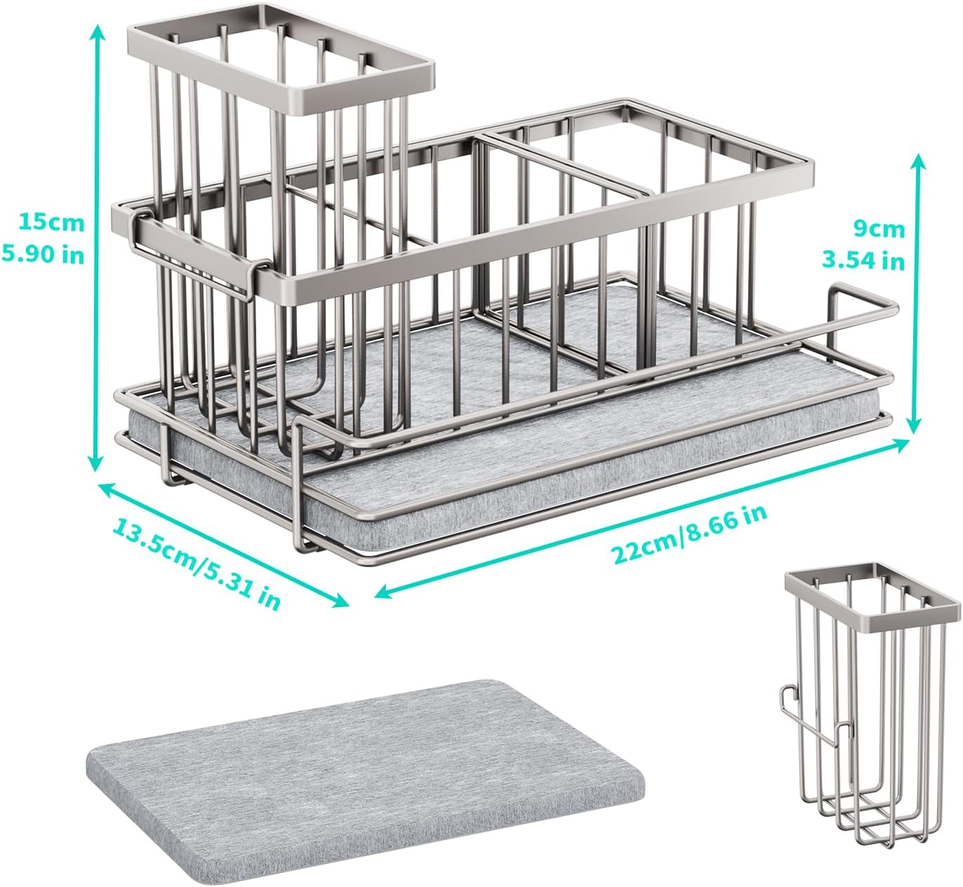 - [Instant Dry Sink Caddy]: The bottom of our sponge holder is made of diatomaceous earth absorbent mat, which automatically absorbs water and dries in 60 seconds, no longer need to manually pour water.The mat is removable, so you can remove it for cleaning