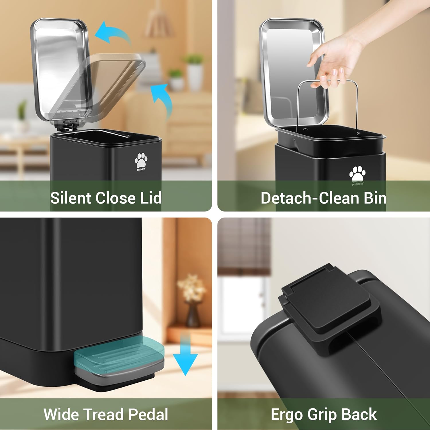 - All-in-One Dog Waste Management System: Keep your yard clean with our dog poop trash can outside set featuring a 12L stainless steel step can with inner bucket, ergonomic pooper scooper, and dual-purpose bag caddy. The waterproof outdoor garbage can includes 20 heavy-duty liner bags (up to 5 gallon cans) and 20 portable scoop bags for on-the-go cleanup. Hands-free operation with foot pedal eliminates direct contact.