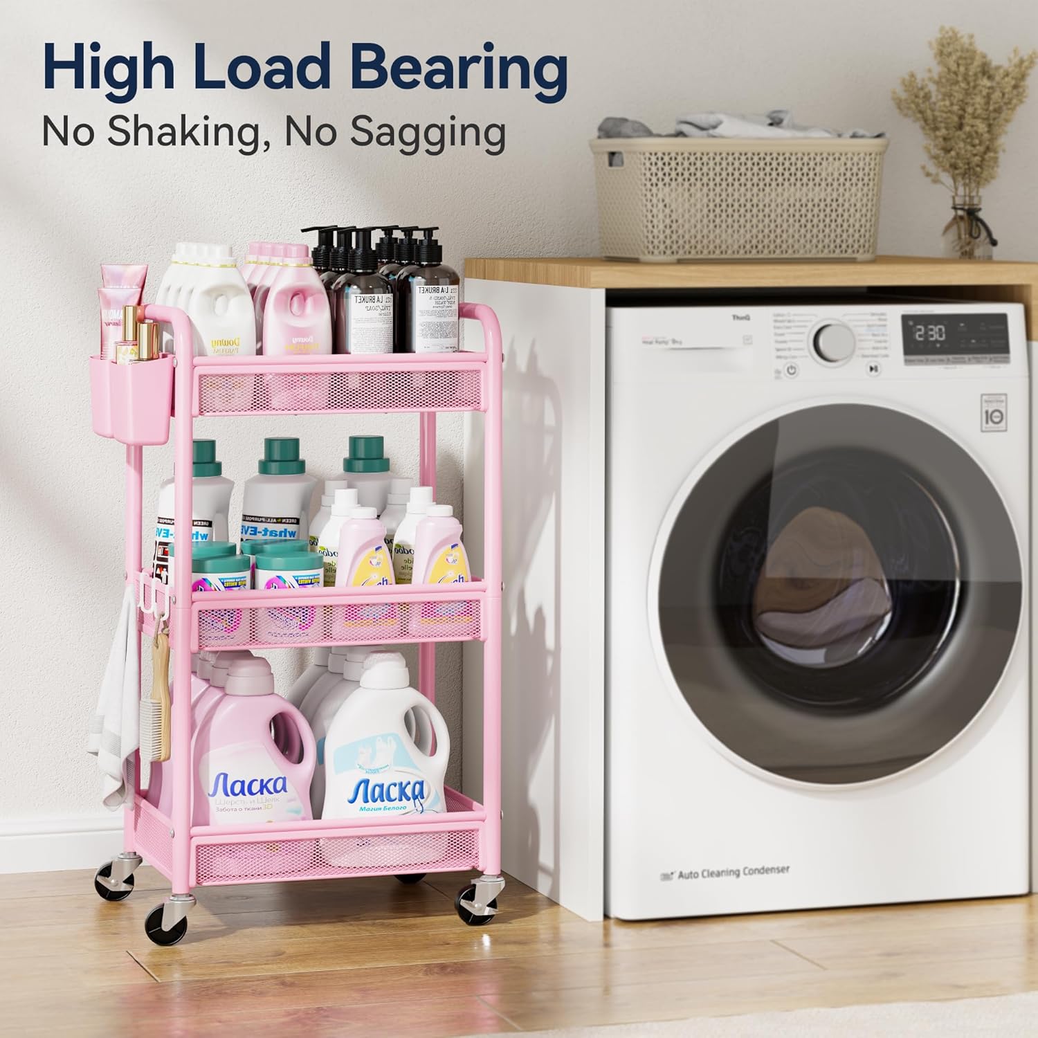 YASONIC 3 Tier Rolling Cart – Metal Utility Storage Cart with Wheels, Craft Cart Organizer with Hanging Cups, Hooks, Mesh Basket for Bedside Kitchen Office Art, Pink