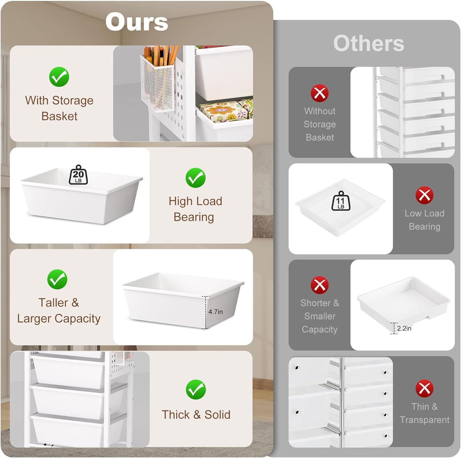 • 【Sturdy Metal Frame & Wooden Top】 Built with a high-quality metal frame and durable PP drawers, this multifunctional storage cart with drawers is made to last. The wooden tabletop adds a warm aesthetic and supports up to 88 lbs—ideal for holding a printer, plants, or decorations. Each drawer holds up to 20 lbs, offering reliable, sag-free storage.