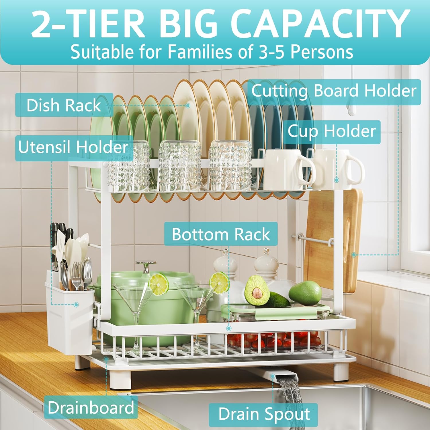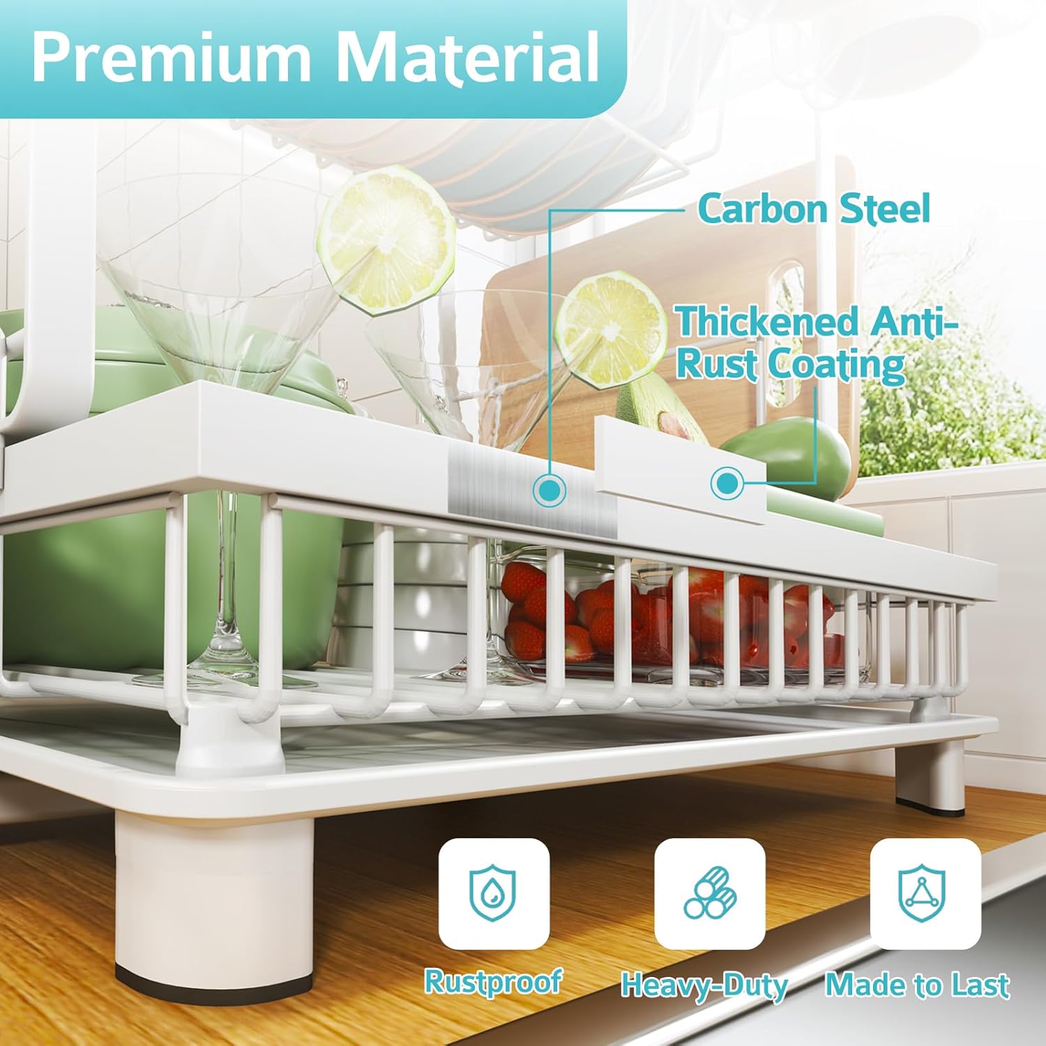 Multifunctional Dish Drying Rack - Rustproof, 2-Tier Dish Racks with Drainboard, Space-Saving Design, Utensil & Cup Holder for Kitchen Counter, White