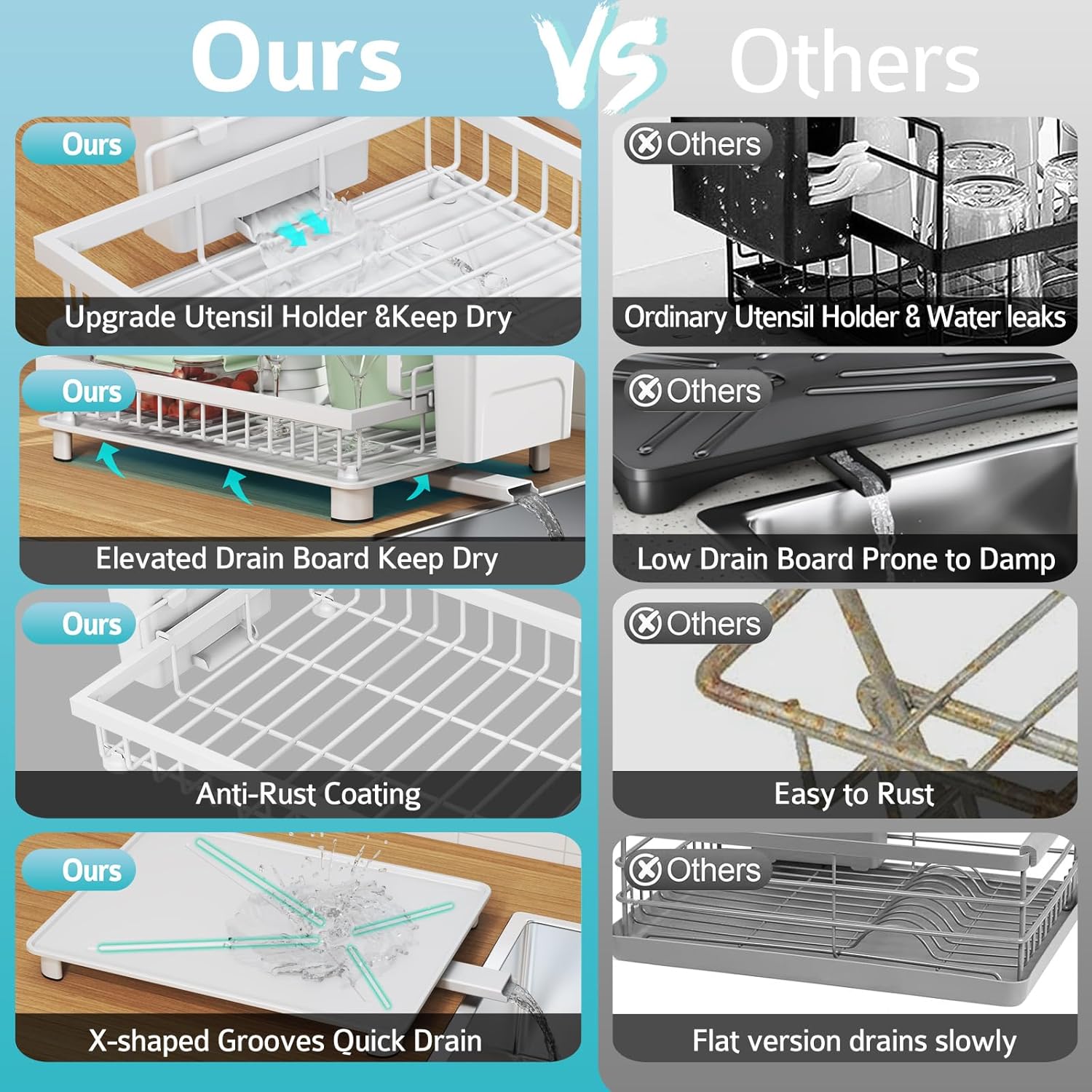- 【100% RUSTPROOF & SUPER STURDY】The Dish Drainer made of heavy duty carbon steel with rust proof coating, the 2 tier dish rack will resist any damage that may cause rust or discoloration - durable and easy to clean. This kitchen dish rack is a solid metal drying rack choice for every household, it passed a 24-hour salt test