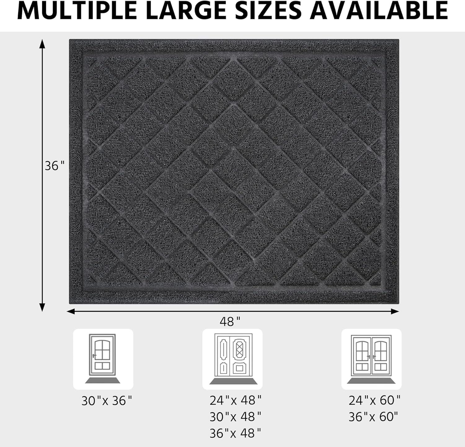 - 【Multi Size】: 24" x 48" , 24" x 60" , 30" x 36" , 30" x 48" , 36" x 48" , 36" x 60" , 36" x 72" , 48" x 72" , 0.4 inch thick , low profile design so doors won't get stuck. Heavy duty extra large door mat entrance rug carpet widely used for outdoor indoor, exterior patio entry way, garage, garden, shopmall with high traffic inside and outside.