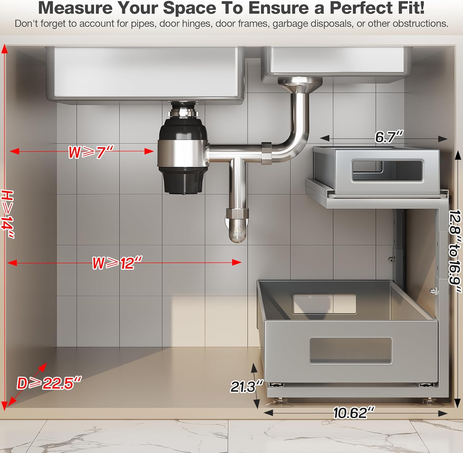 • 【Height Moves to Fit Your Storage Needs】Crafted with an L-shaped design and 5 adjustable heights(12.8–16.9 in),under sink pull out organizer seamlessly adapts to your cabinet, flexibly adjusting its height to navigate around pipes while maximizing vertical storage.