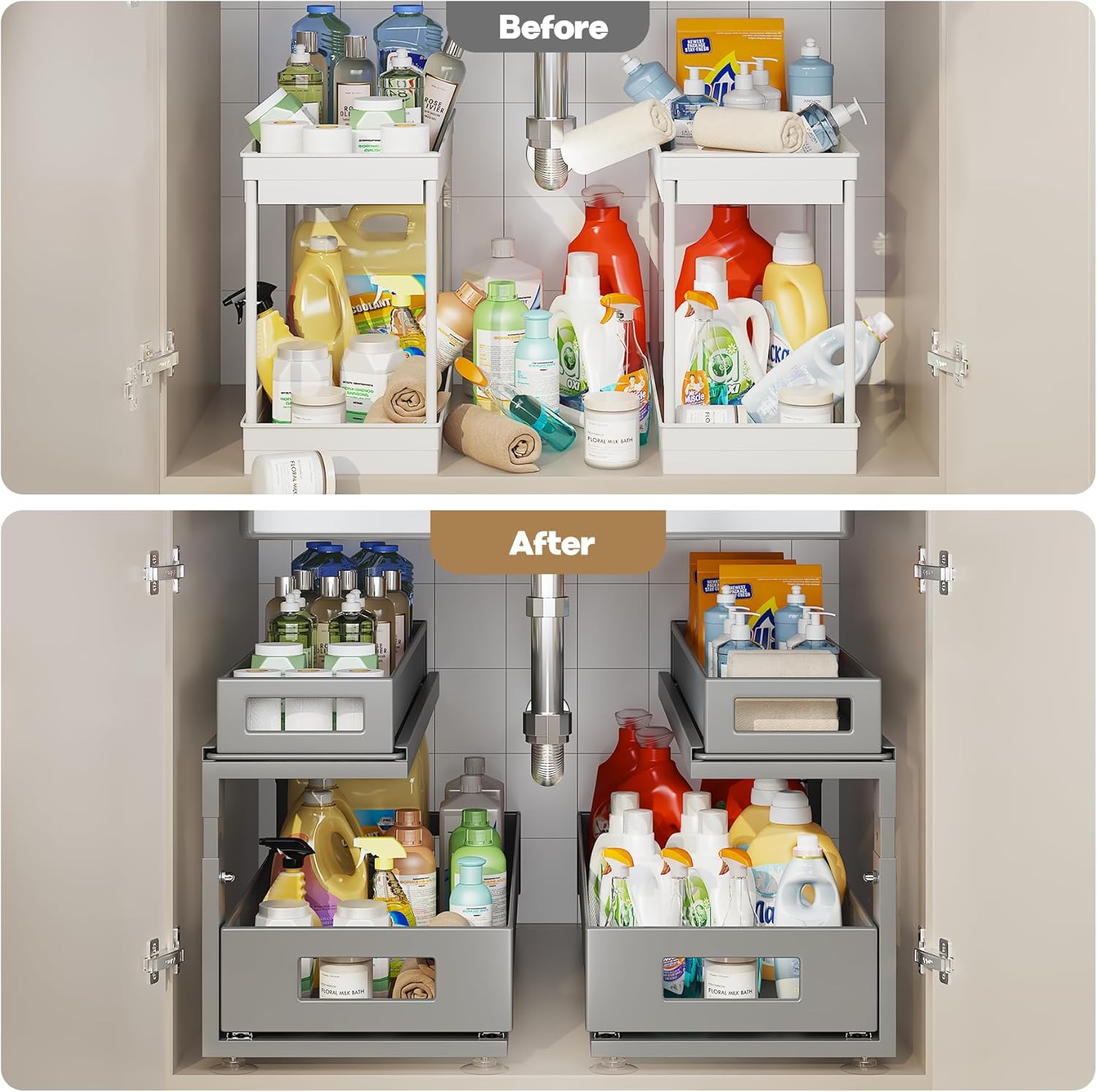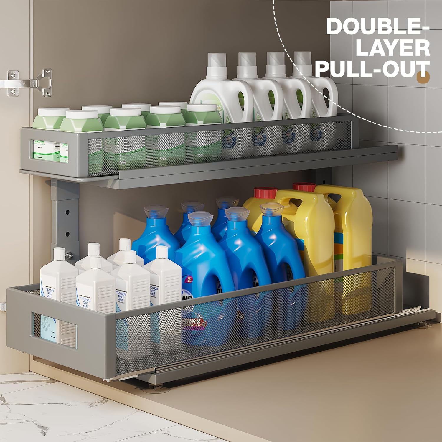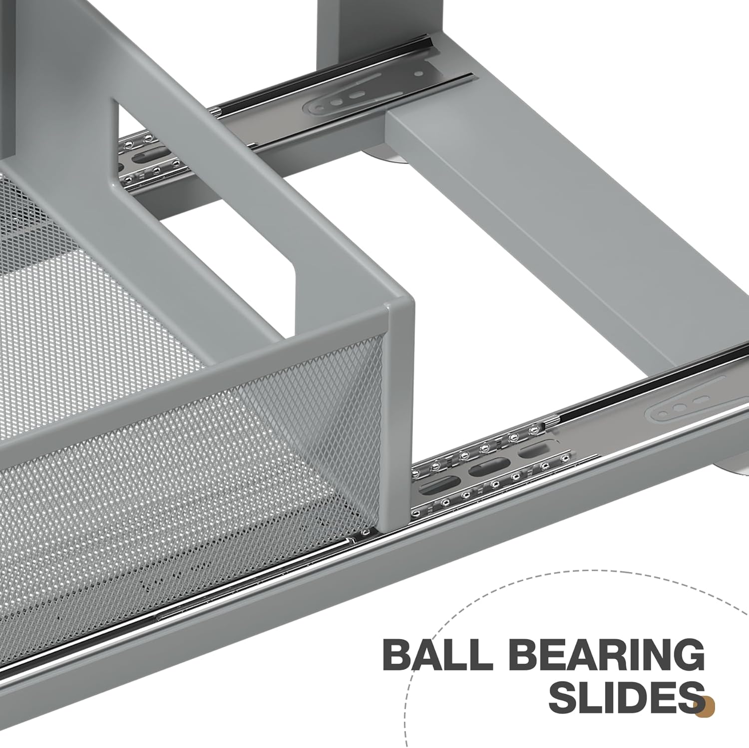 2 Pack 21.3IN-Depth Under Sink Organizer with Next-Gen Ball-Bearing Slides,2-Tier Pull Out Cabinet Storage,Height Adjustable Drawer Shelf for Bathroom,Kitchen,Laundry,Cabinet,Pantry-Gun Gray