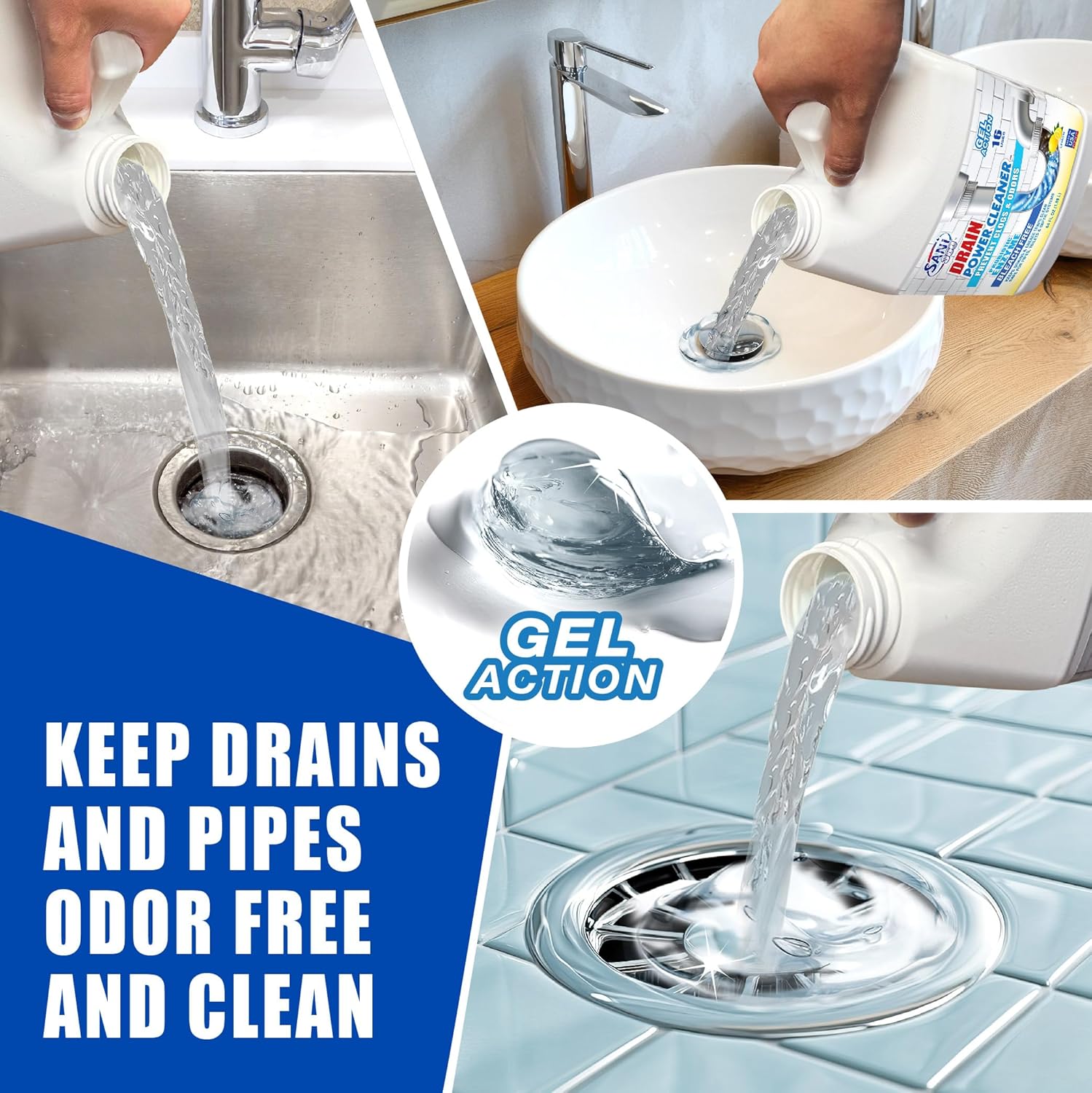• ENZYME Action Drain & Pipe GEL Cleaner: Rapidly eliminates foul odors, breaks down food waste, fats, oils, and soap residue. Regular probiotic formula keeps sinks and drains, free-flowing and odor-free. Sani 360° Drain Power Cleaner leaves a fresh lemony scent. Ready-to-use formula.