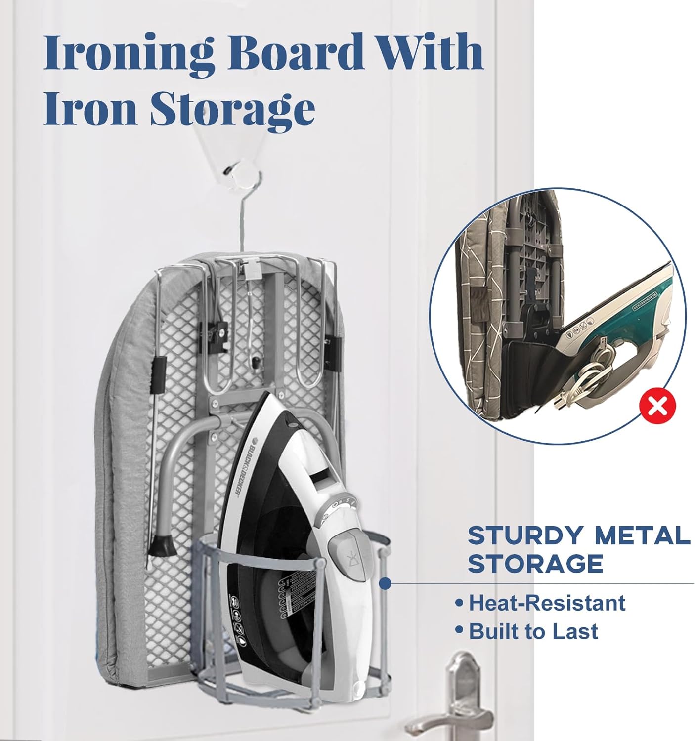• Iron Storage: Features a metal iron holder to securely place your iron when not in use, keeping your ironing area neat and organized.