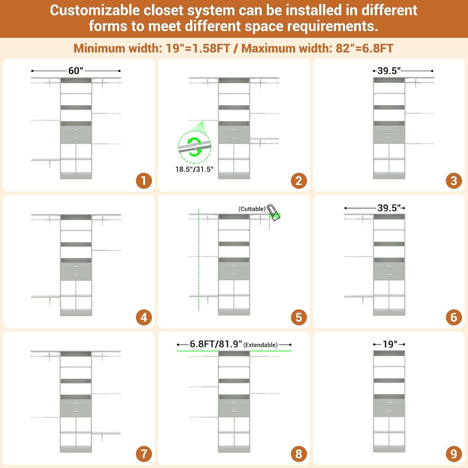 • Customizable Closet System - Besiost closet system with drawers is a valuable addition to your nursery organization and walk-in closets. The small modern closet comes with additional cuttable shelves and adjustable hanging rods, designed to fit well in nurseries of varying sizes.