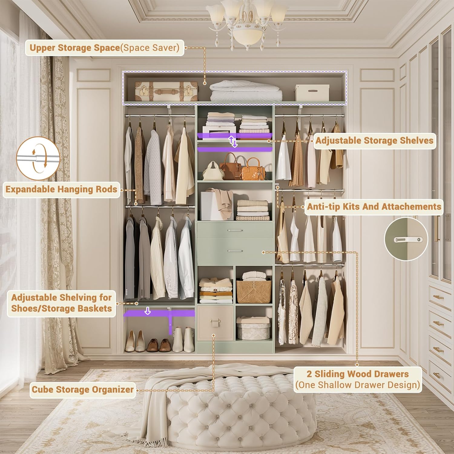 5FT Small Closet System, Baby Closet Organizer System with Wooden Drawers, 60 Inches Walk in Closet System with 5 Hanging Rods and 3 Reversible Hanging Shelving, Crab Green