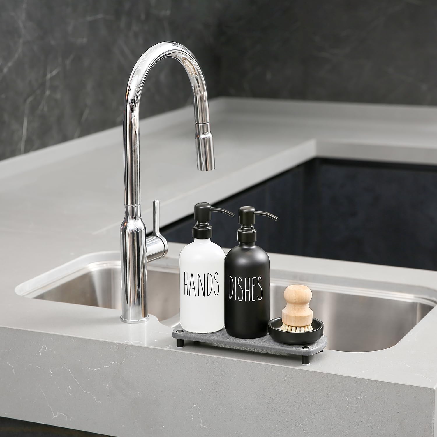 • [Complete Kitchen Cleaning Solution] This set includes one dish soap bottle, one hand soap bottle, a kitchen dish brush, and a ceramic brush holder, all neatly arranged on a stone drying tray.