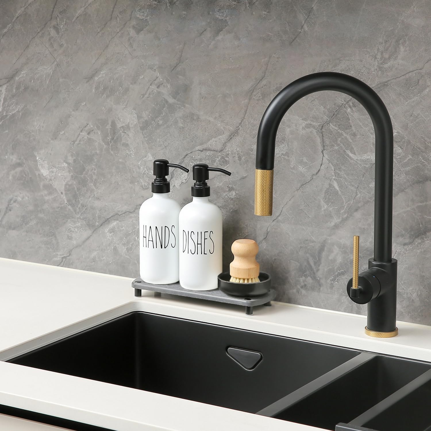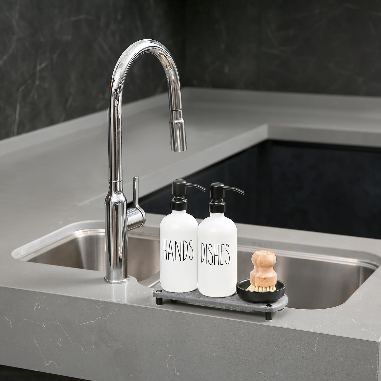 • [Complete Kitchen Cleaning Solution] This set includes one dish detergent dispenser, one hand wash dispenser, a kitchen dish brush, and a ceramic brush holder, all neatly arranged on a stone drying tray.