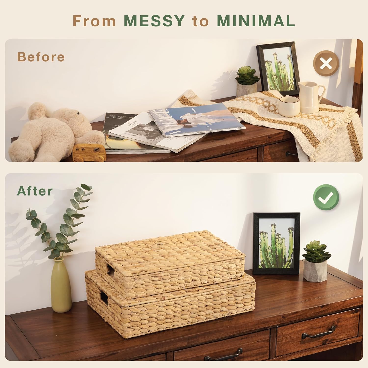 • Instant Clutter Control: These woven baskets with lid are perfect for quickly tidying up any space. Effortlessly conceal clutter and maintain a neat, organized look in your living room, bedroom, bathroom, or office.