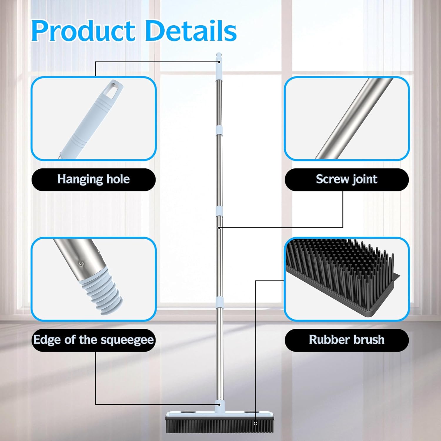 Rubber Broom Carpet Rake for Pet Hair Removal, Fur Remover Broom with 59" Adjustable Handle, Portable Detailing Lint Remover Brush, Soft Push Broom with Squeegee for Carpet, Hardwood Floor, Tile