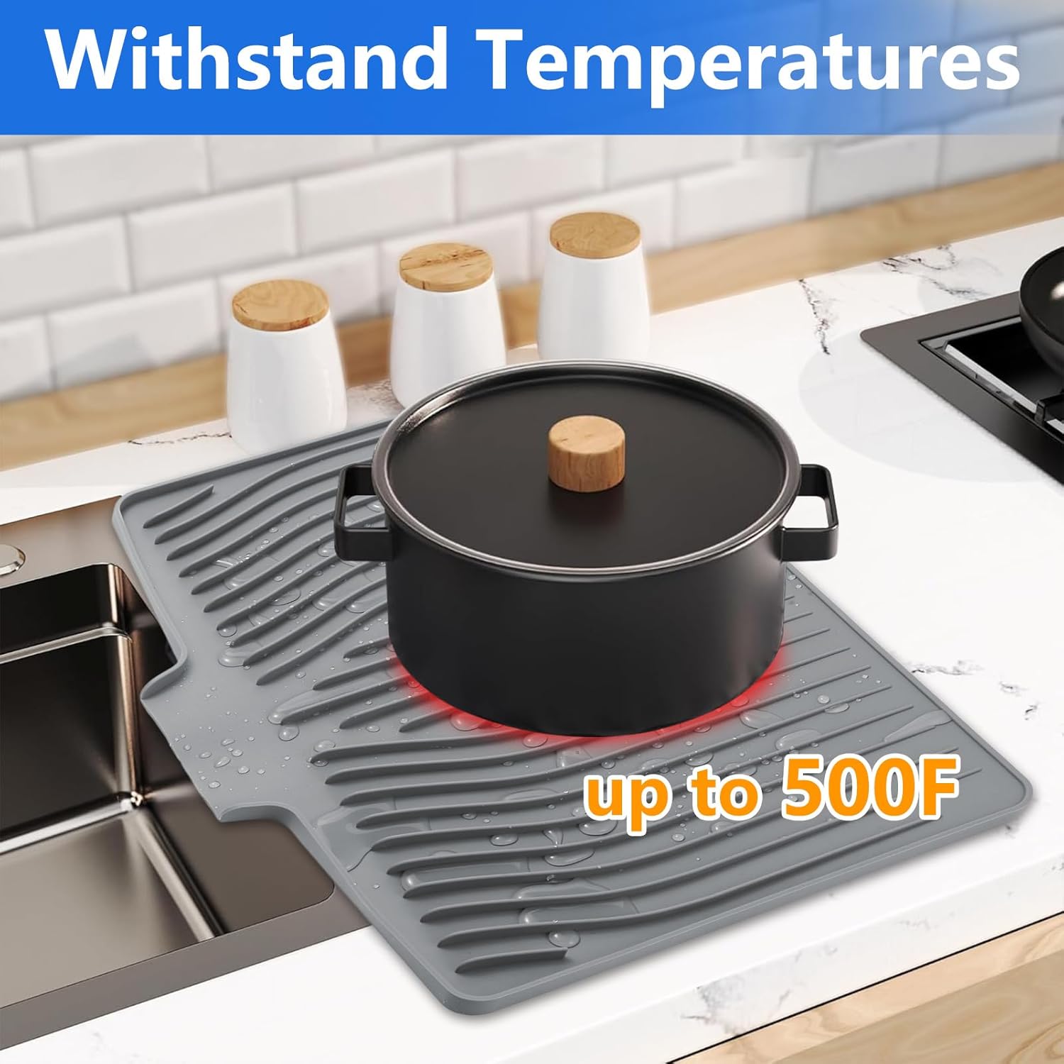 • Fast Drying: Silicone dish drying mats are designed with raised stripes to increase air circulation, which speeds up the drying process and allows your utensils to dry faster. The specially designed edges allow water to drain directly into the sink. This keeps your countertops dry