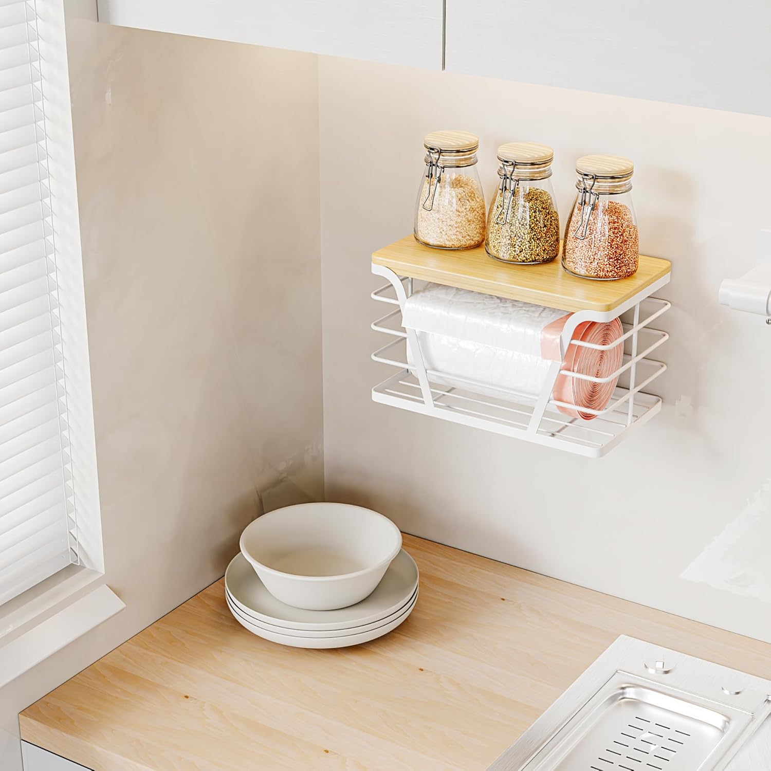 Small Grocery Bag Holder, Trash Bag Dispenser with Removable Bamboo Top, No Drill,White