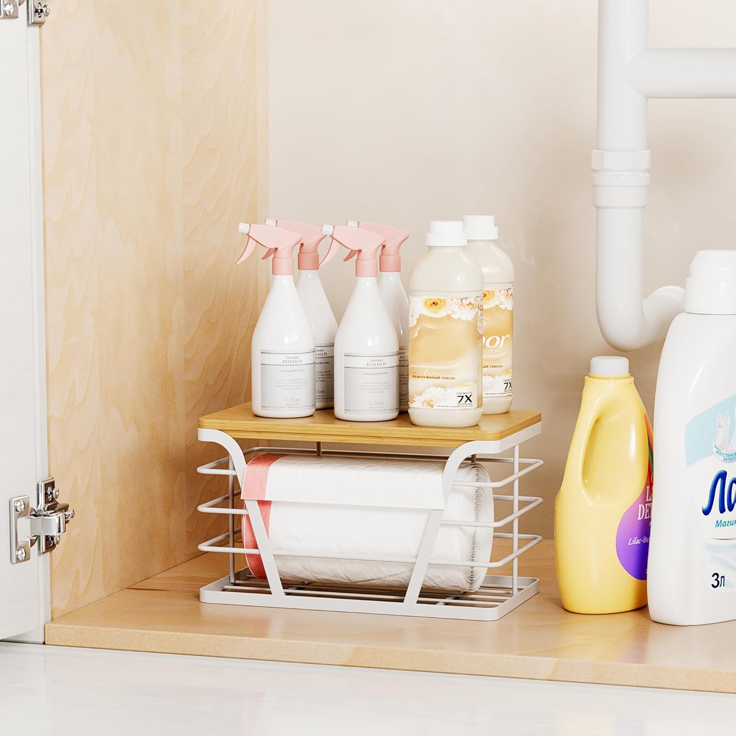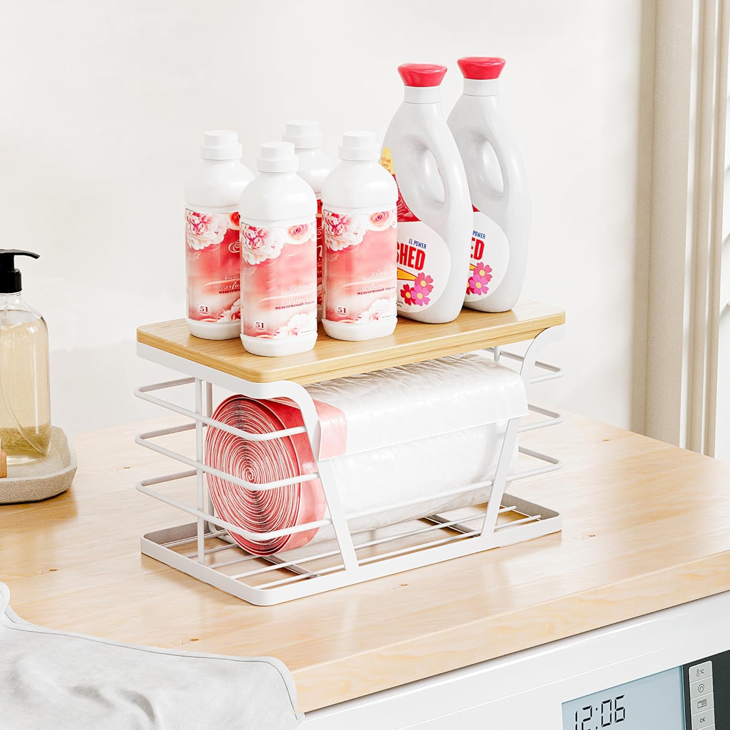 • TRASH BAG ORGANIZER: Includes a grocery bag holder with removable bamboo top and adhesive for easy installation; wall-mounted design maximizes space in laundry room and kitchen; perfect for storing small garbage bags, or using the lid as an extra shelf for groceries and other small items