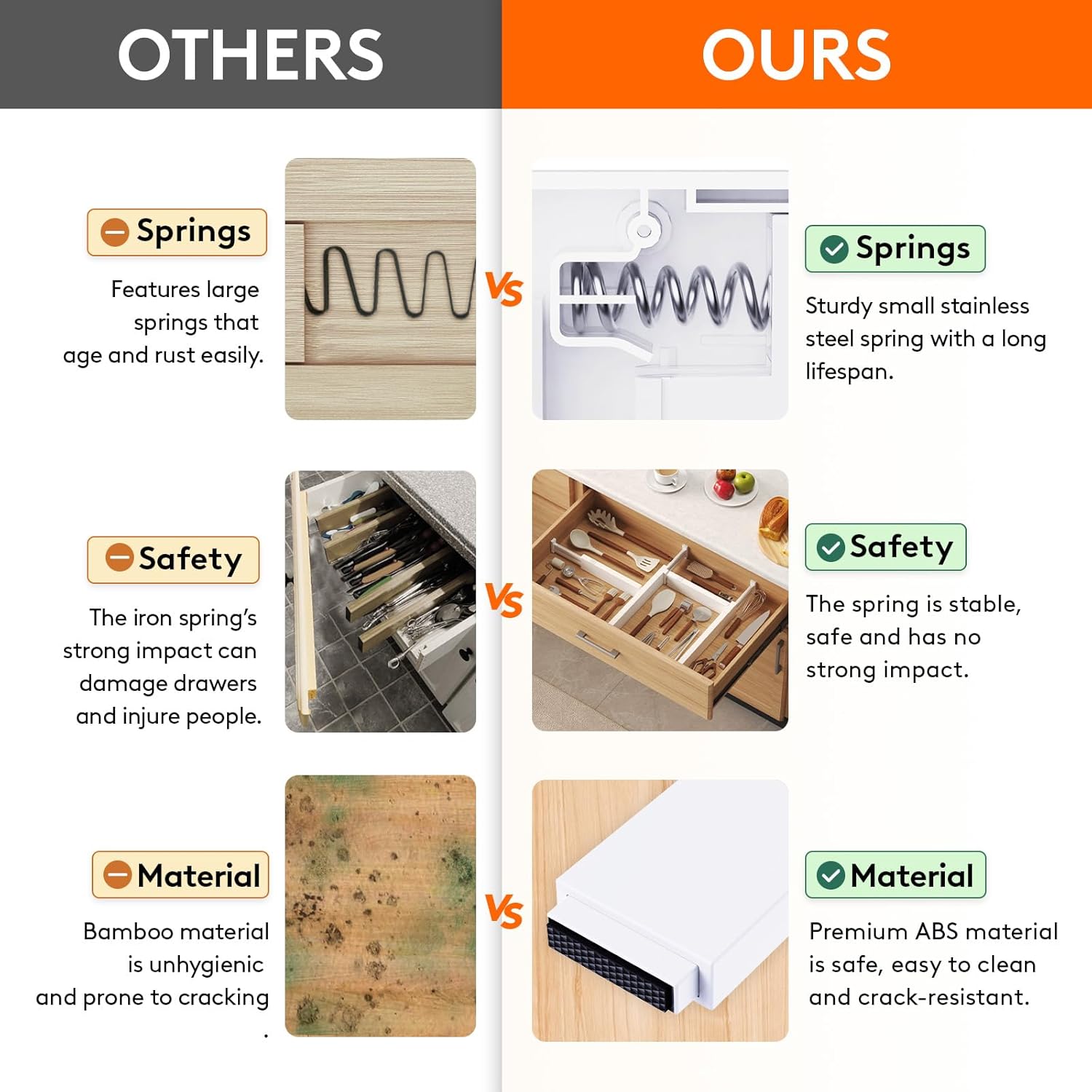 • Stable Construction: Featuring a teeth lock for powerful support and adjustability, strong springs for high elasticity and strong reinforcement, and anti-slip foams for frim grip. Our kitchen drawer organizer is patented (Patent No: US12133593B2) for a unique experience