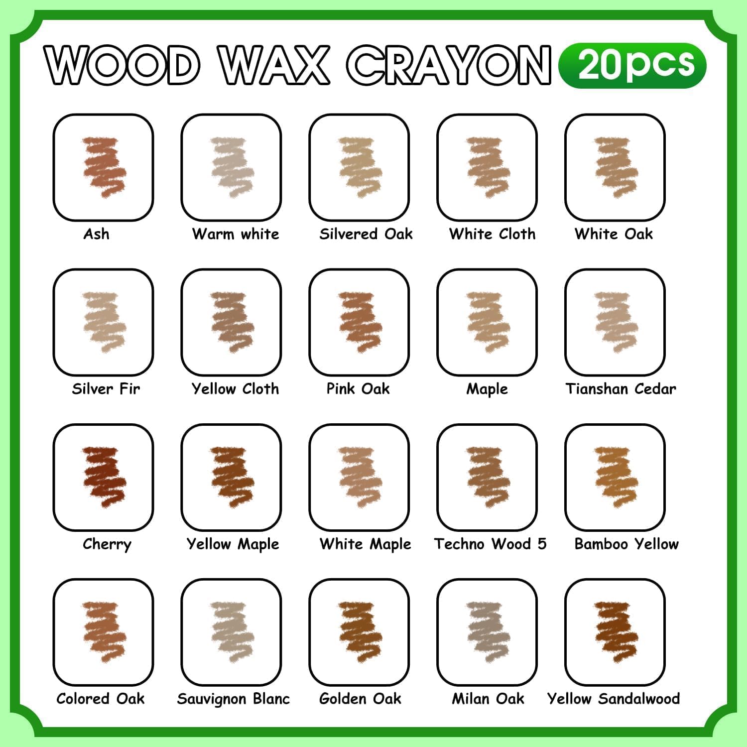 • 【20 Different Colors】: Wood furniture repair kit includes 20 colors: Maple, White Oak, White Maple, Pink Oak, Golden Oak, Yellow Maple, Bamboo Yellow, Colored Oak, Sauvignon Blanc, Milan Oak, White Cloth, Warm white, Yellow Cloth, Ash, Techno Wood 5, Silvered Oak, Silver Fir, Tianshan Cedar, Yellow Sandalwood, Cherry