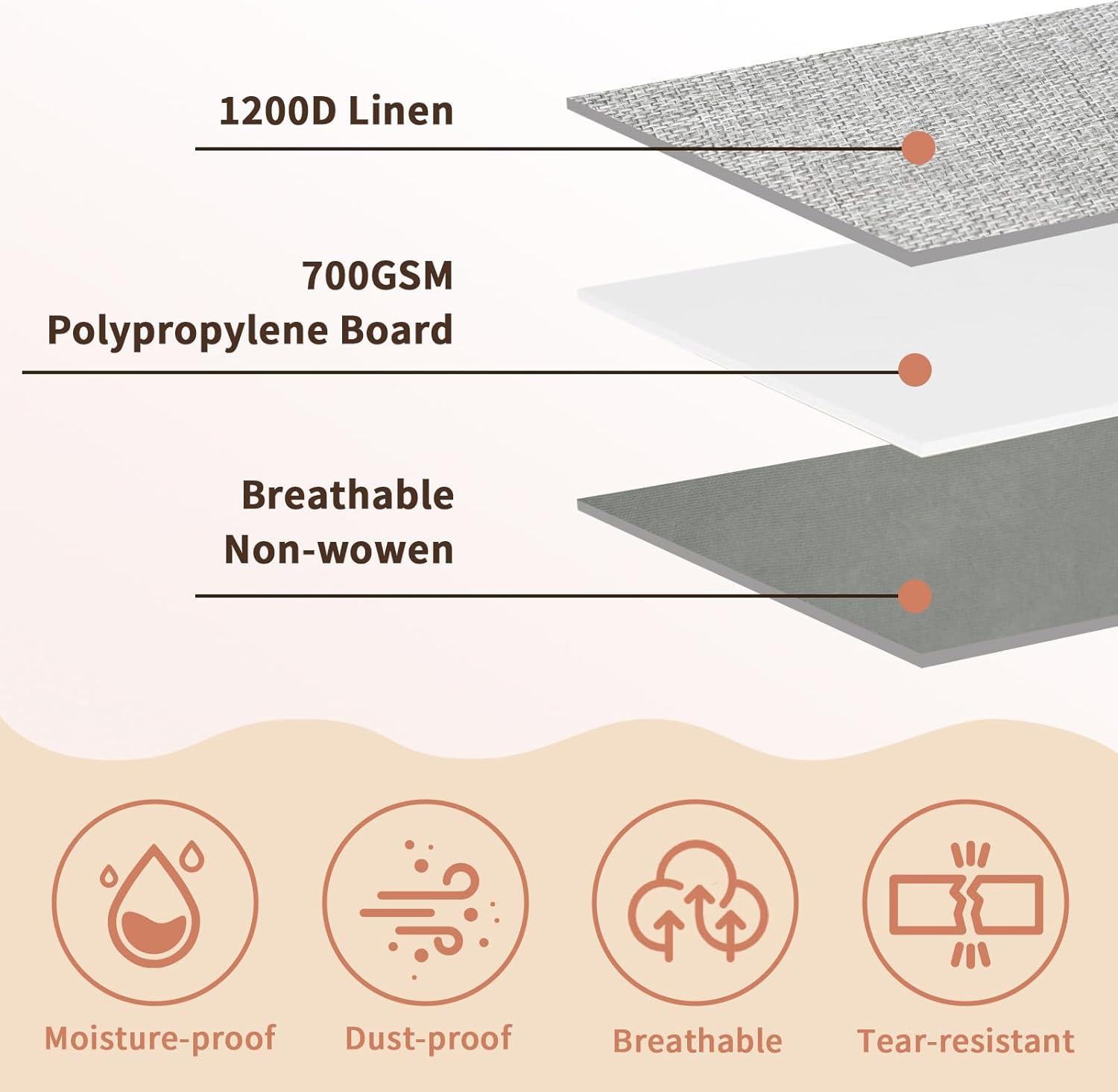 • Great Material: Made with 1200D linen and breathable non-woven fabric, resists tearing, dust, and moisture. Thick PVC cover adds waterproof protection