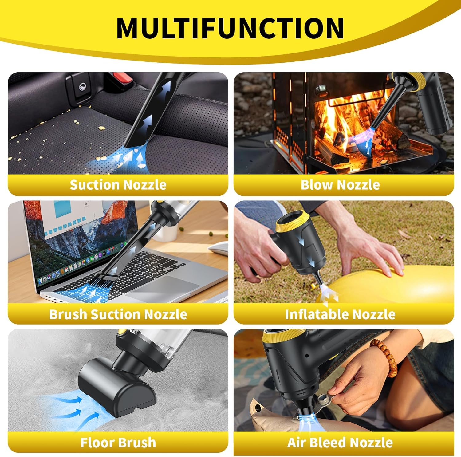 • 4-in-1 Multifunctional Design – Effortlessly switch between blowing dust, vacuuming debris, deep-cleaning with vacuum suction, and inflating items like air mattresses or sports balls. Perfect for cars, homes, garages, camping, and outdoor adventures.