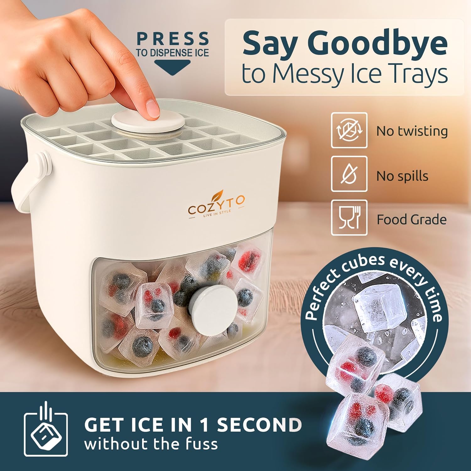 COZYTO CubeGo Ice Cube Tray with Lid and Storage Bin – One-Press Release, 48 Mini Ice Cubes, BPA-Free, Odor-Proof, Includes Scoop – DIY Fruit Ice for Cocktails, Drinks & Smoothies (Cream White)