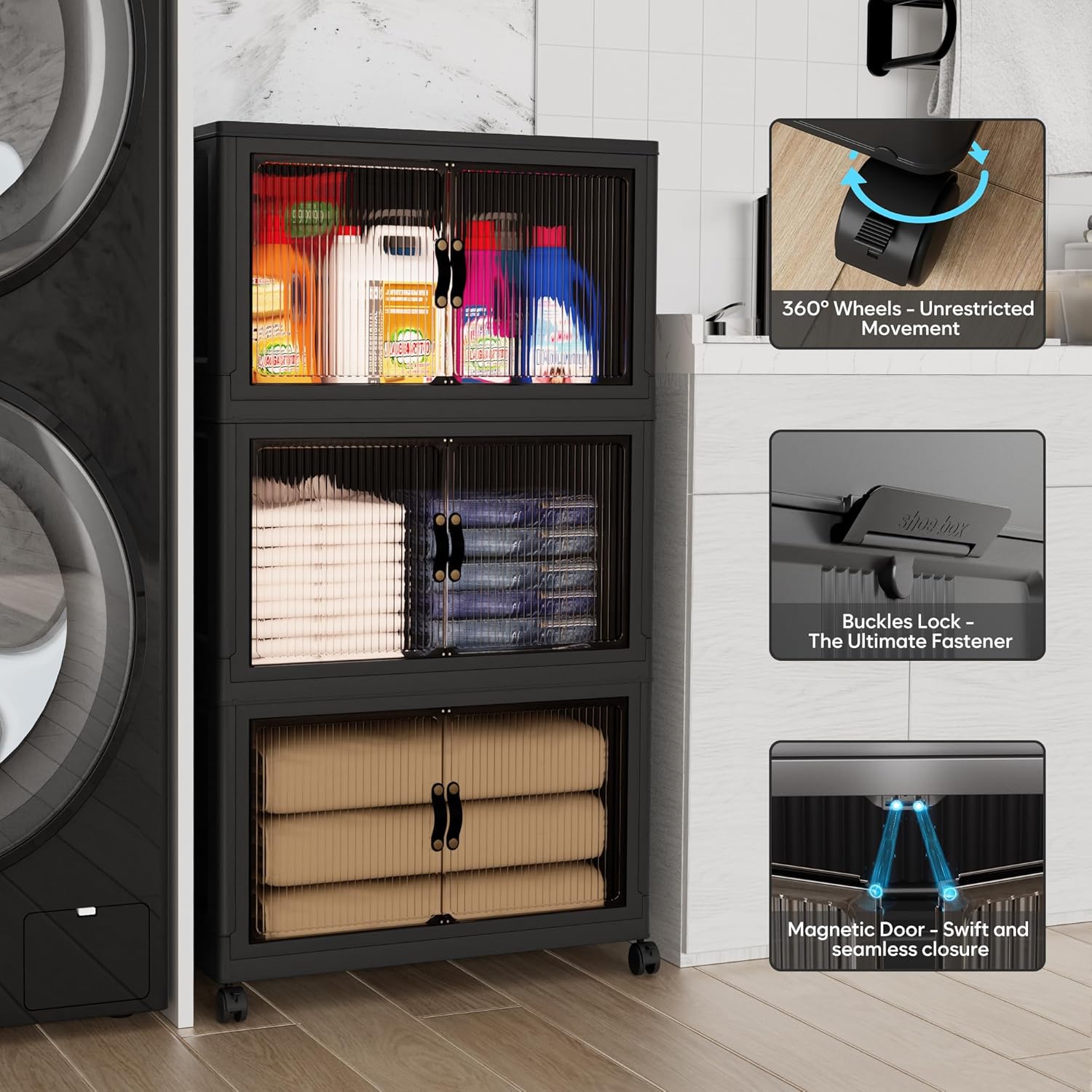 Jalove 50QT Plastic Storage Bins with lids, Stackable Collapsible Storage Containers with Wheels, Closet Organizer and Storage Drawers, Clothes Storage Cabinet for Home Office Garage, 3 Pack Black