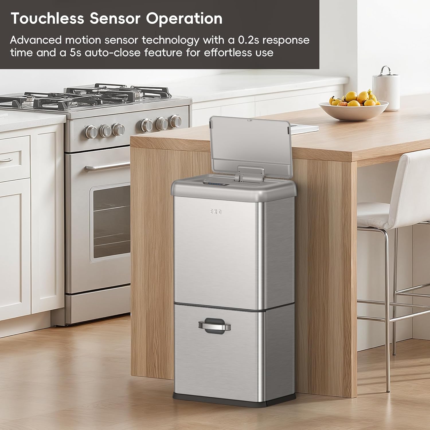 • Premium Motion Sensor Technology – Equipped with a lightning-fast 0.2-second sensor and whisper-quiet soft-close lid for a seamless user experience with this automatic trash can.