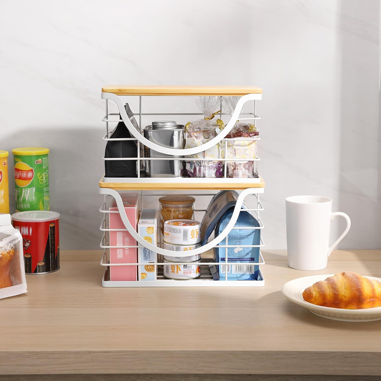 • 2 Ways to Use -stackable wire basket with bamboo top can be used on a tabletop or self-adhesive wall mounted. No need to drill holes, won't damage the wall. Multi-functional Garbage Bag Storage Dispenser is suitable for kitchen, laundry room, toilet, under the sink, cabinet, etc., you can store laundry supplies, cleaning supplies, vegetables and fruits, snacks and so on