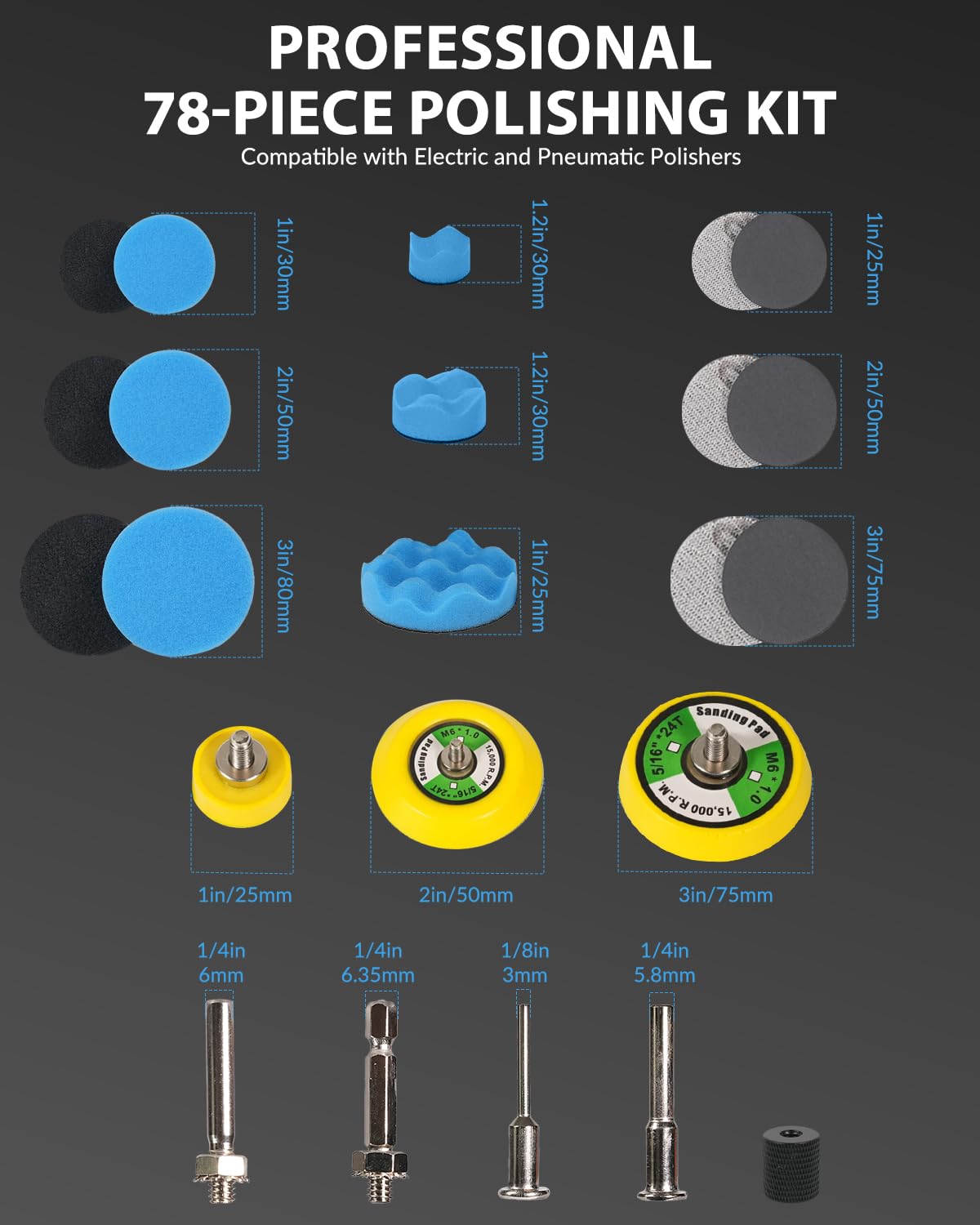 78PCS Drill Polishing Buffing Pads Kit with Buffer Polisher Attachment, 1/2/3 Inch Car Polishing Detailing Wheels for Dremel Air Mini Polisher Sander, Headlights Restoration Pad for Waxing Cleaning