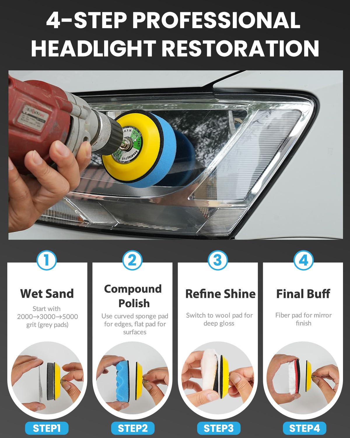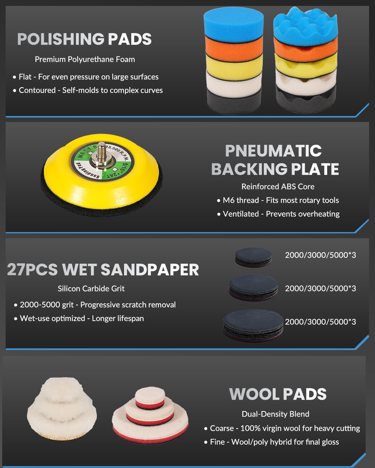• Polish & Prep Anywhere: Go beyond polishing pads with 27 PCS extra 1/2/3 inch carbide silicon sanding discs (2000/3000/5000 grit) for perfect prep work. The rugged waterproof oxford bag keeps all pads and sandpapers organized – perfect for auto body repair buffing, headlight restoration or on-the-go jobs