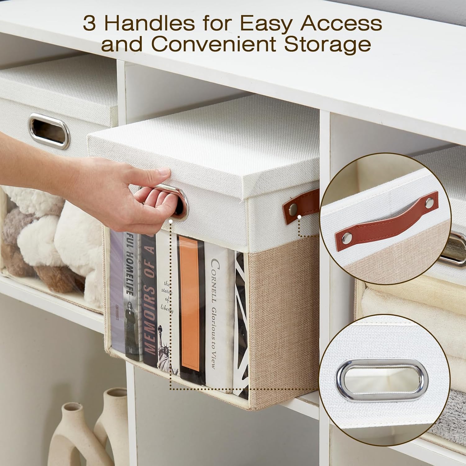- Sturdy 3 Handles: Our clear cube storage bins upgraded to 3 handles, the sturdy PU handles easy-to-grab handles make carrying simple and allow easy access to bins, even from high places. A front metal handle has also been added, making pulling and moving the storage organizer from closets, under beds, and bookshelves easy and effortless.