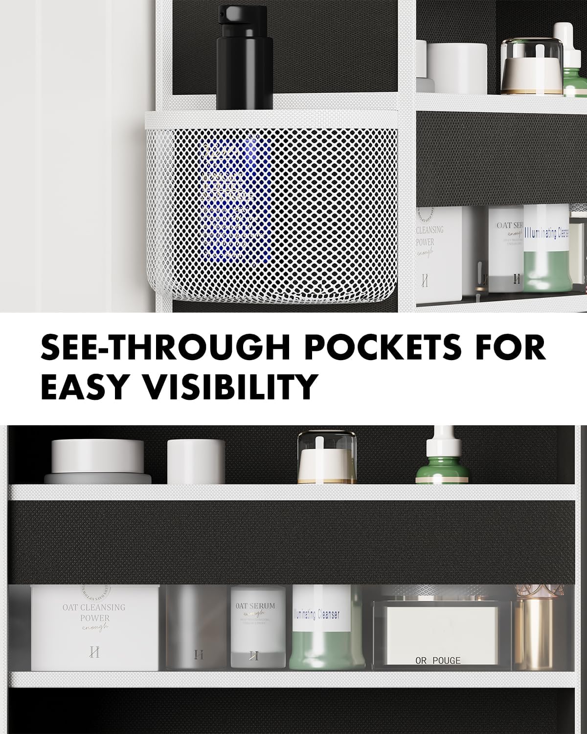 - Anti-Tilt Safety Structure Design: 6 tier door hanging organizer is made of high quality double-layer non-woven fabric, durable, breathable, safe and non-toxic. Our over the door bathroom organizer feature sturdy seams to close the pockets and are reinforced with strong cardboard on the front, sides and bottom to prevent sagging and tilting, ensuring that the organizer stays upright and secure. The back is equipped with four velcro straps to ensure that the hanging door organizer fit snugly against the door panels and will not move/shake when opening and closing the door.
