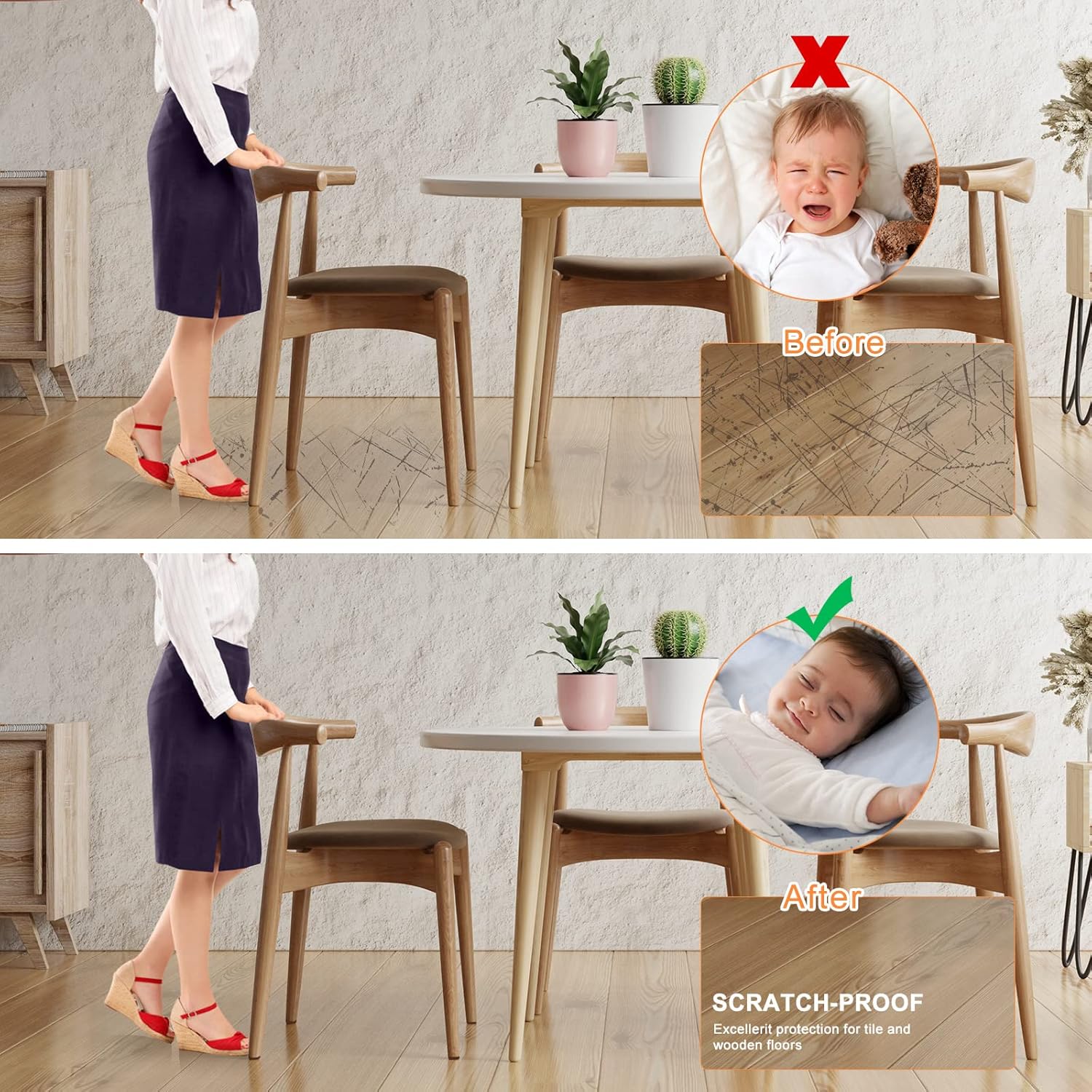 • ❤️STOP SCRATCHING YOUR FLOORS❤️ Place our felt furniture pads on the legs of your furniture to avoid scratching or scuffing your beautiful wooden, laminate or tiled floors. And you never have to hear that annoying scraping noise again. We suggest that the furniture is lifted instead of being slid on the floor in order to prevent the furniture pads from coming off.