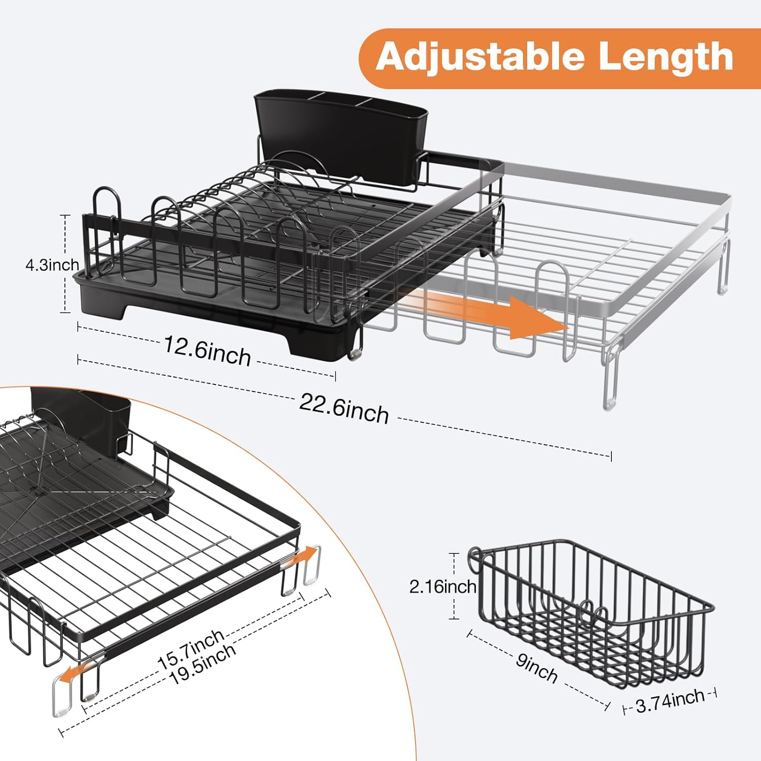 • Extendable & Spacious Design: Our dish drying rack adopts an extendable design, expanding from 22.6" (57.5cm) in length to fit your kitchen needs. With a generous 16.5" (42cm) width and 4.3" (11cm) height, this multifunctional dish rack provides ample space for cups, bowls, plates and pans.