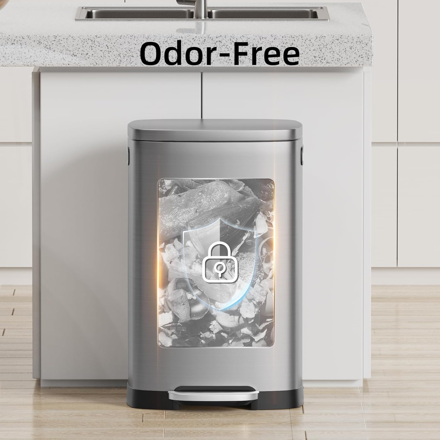 • ๐Ÿšฎ Large Capacity & Odor Lock Technology: 50L (13 Gallon) extra-large capacity reduces frequent trash runs, perfect for busy kitchens. Sealed lid with odor-blocking design traps smells, keeping your space fresh and clean.