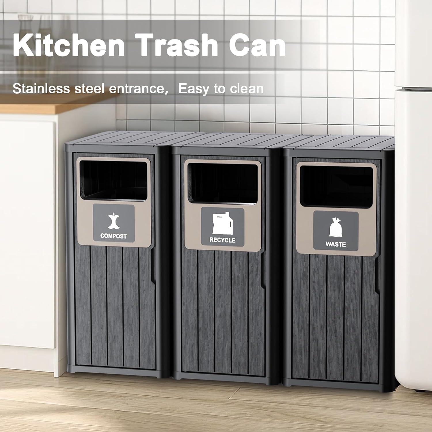 Outdoor Three Barrel Trash Can,Waterproof Resin Garbage Can with Garbage Labels,Durable Waste Bin for Porch, Backyard,Kitchen,for 30 to 39 Gallon Trash Bags
