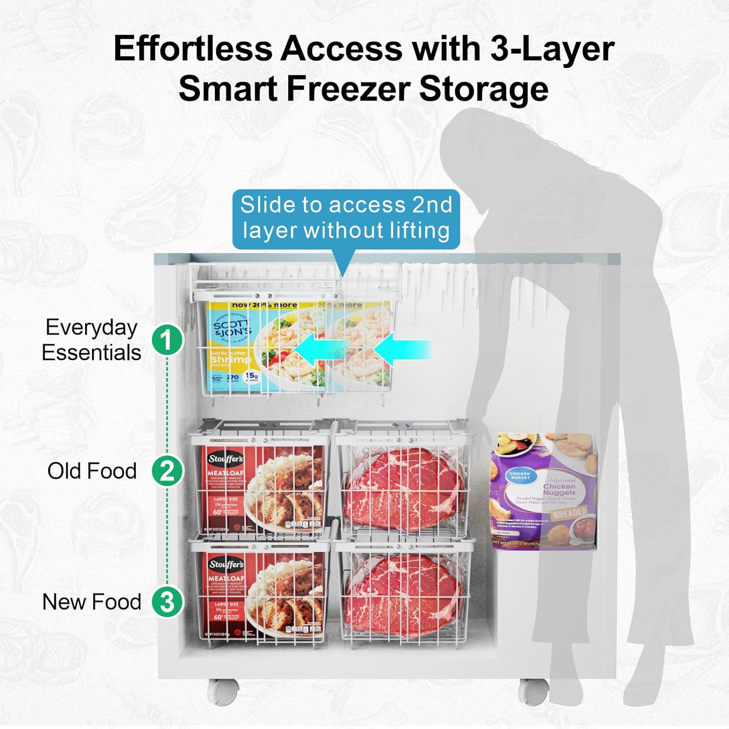 • [Easy to Get & Rearrange] Fold down the handles to stack the chest freezer organizer bins to fully use the freezer space; Easily lift the bottom basket to get items, When organizing the freezer, just need to rearrange the chest freezer basket, without having to rearrange each package of food