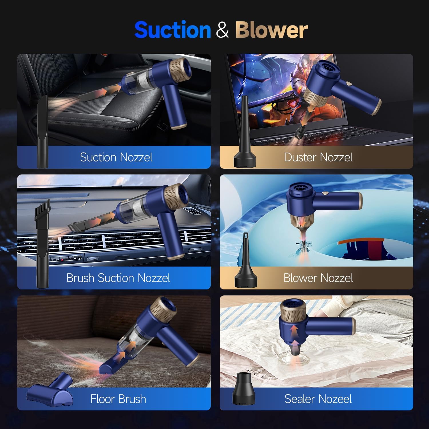 - 【7-in-1 Multifunctional Cordless Car Vacuum Cleaner】: The handheld vacuum cordless with 7 accessories supports multiple modes, such as vacuuming, blower, inflation, pump. Hand vacuum can meet different need for daily cleaning tasks and even clean hard-to-reach corners, such as blowing or vacuuming dust or debris from seats, keyboards, computer host, camera lenses and cabinet corners, or inflating or expeling air from swimming rings and mattresses, or Blow air for BBQ fire, etc