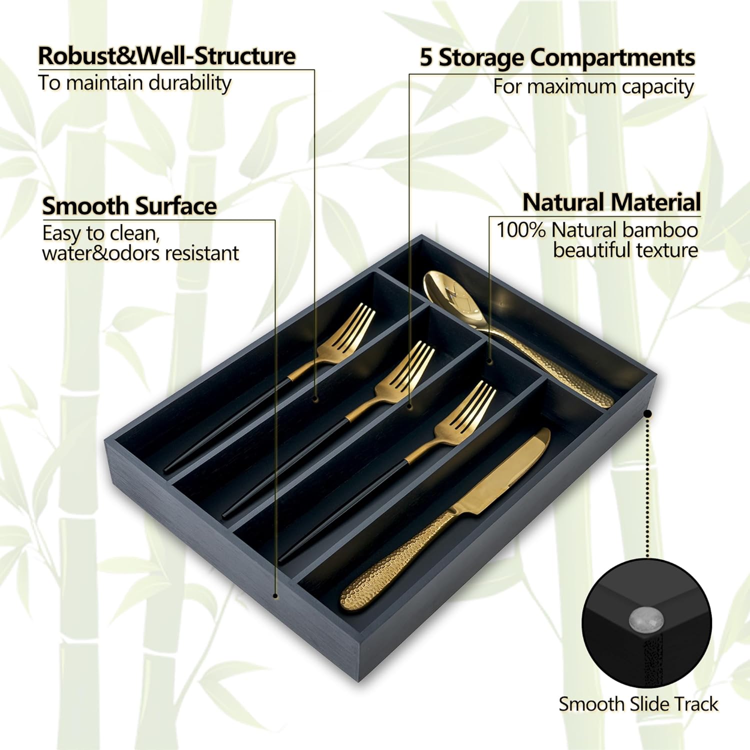 - Built to Last: Crafted from premium bamboo aged 4+ years, this drawer organizer is tough enough for daily use. The eco-friendly material resists water, odors, and even knife scratches—no more unsightly marks! Unlike plastic or metal organizers, its classic, natural look shines with unique, evenly textured bamboo grain that adds warmth to your kitchen.