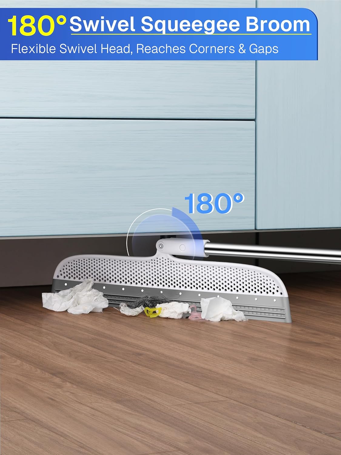 • 【180-Degree Maneuverability】The swivel head on this ​squeegee broom​ pivots to clean tight spaces regular brooms miss. Easily reach under furniture and into corners with the flexible ​rubber broom​ design.