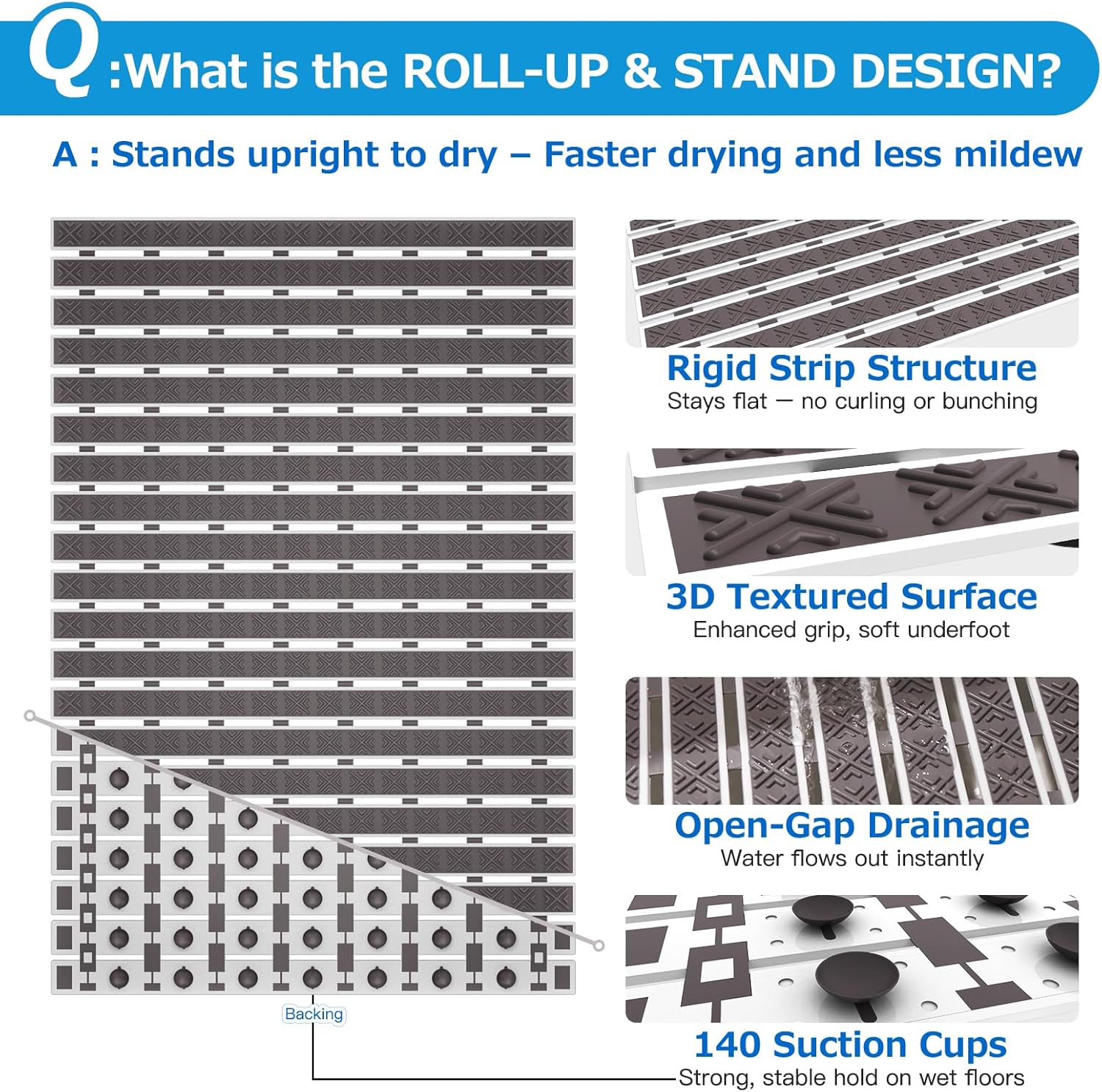 • ✅【Fast Drainage & Upright Drying】Unique drainage holes prevent water from pooling, while the roll-up design allows the mat to stand upright after use — promoting faster drying and better hygiene.