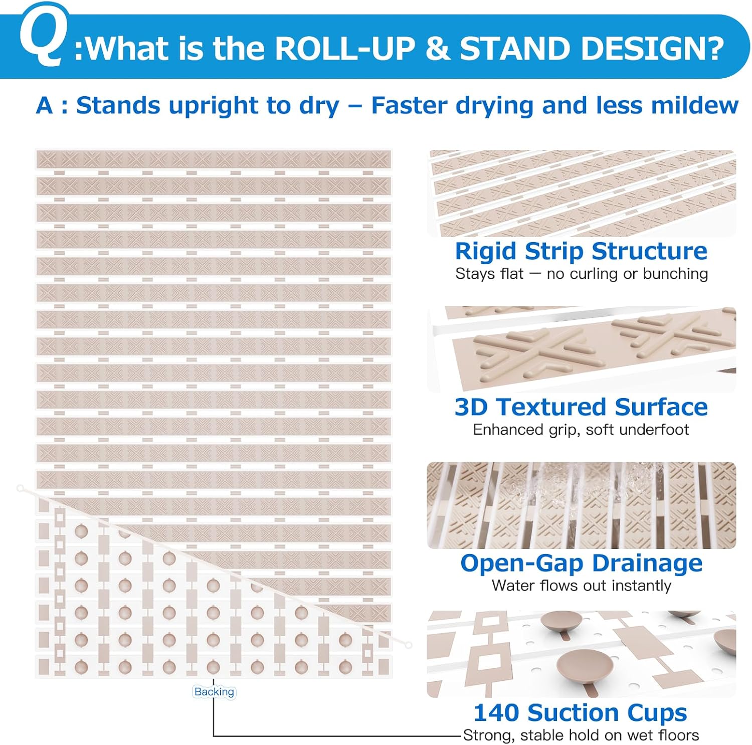 • ✅【Fast Drainage & Upright Drying】Unique drainage holes prevent water from pooling, while the roll-up design allows the mat to stand upright after use — promoting faster drying and better hygiene.