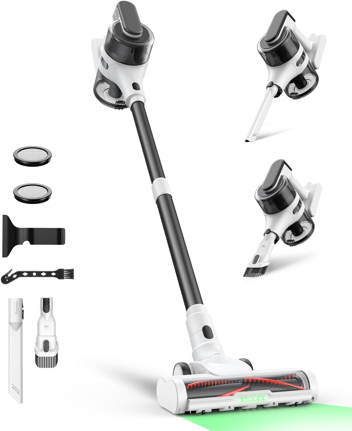 Cordless Stick Vacuum Cleaner for Home, Lightweight Rechargeable Vacuum with 55min Runtime, Powerful Suction, Green LED Headlight, 9-in-1 Pet Hair Carpet & Hardwood Floor Cleaner