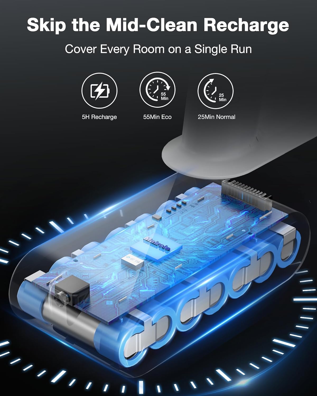 - 𝟱𝟱 𝗠𝗶𝗻𝘂𝘁𝗲𝘀 𝗼𝗳 𝗖𝗼𝗻𝘁𝗶𝗻𝘂𝗼𝘂𝘀 𝗣𝗼𝘄𝗲𝗿: Clean more, charge less. This rechargeable vacuum delivers up to 55 minutes of runtime—enough to cover up to 1500 sq ft in one go. Perfect for busy homes and multi-surface deep cleaning.