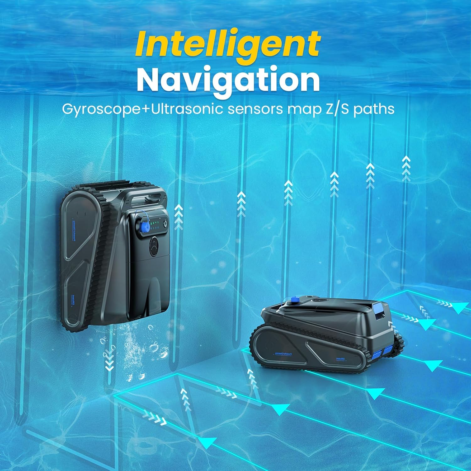 - 【Intelligent Cleaning Navigation】Using advanced gyroscopes and ultrasonic sensors, this smart pool vacuum for inground pools follows systematic Z-pattern and S-patten to minimize overlap and can climb obstacles like ladders, drains, or pool lights. Pool robot guarantees complete coverage without missing spots—ideal for pools with complex layouts.