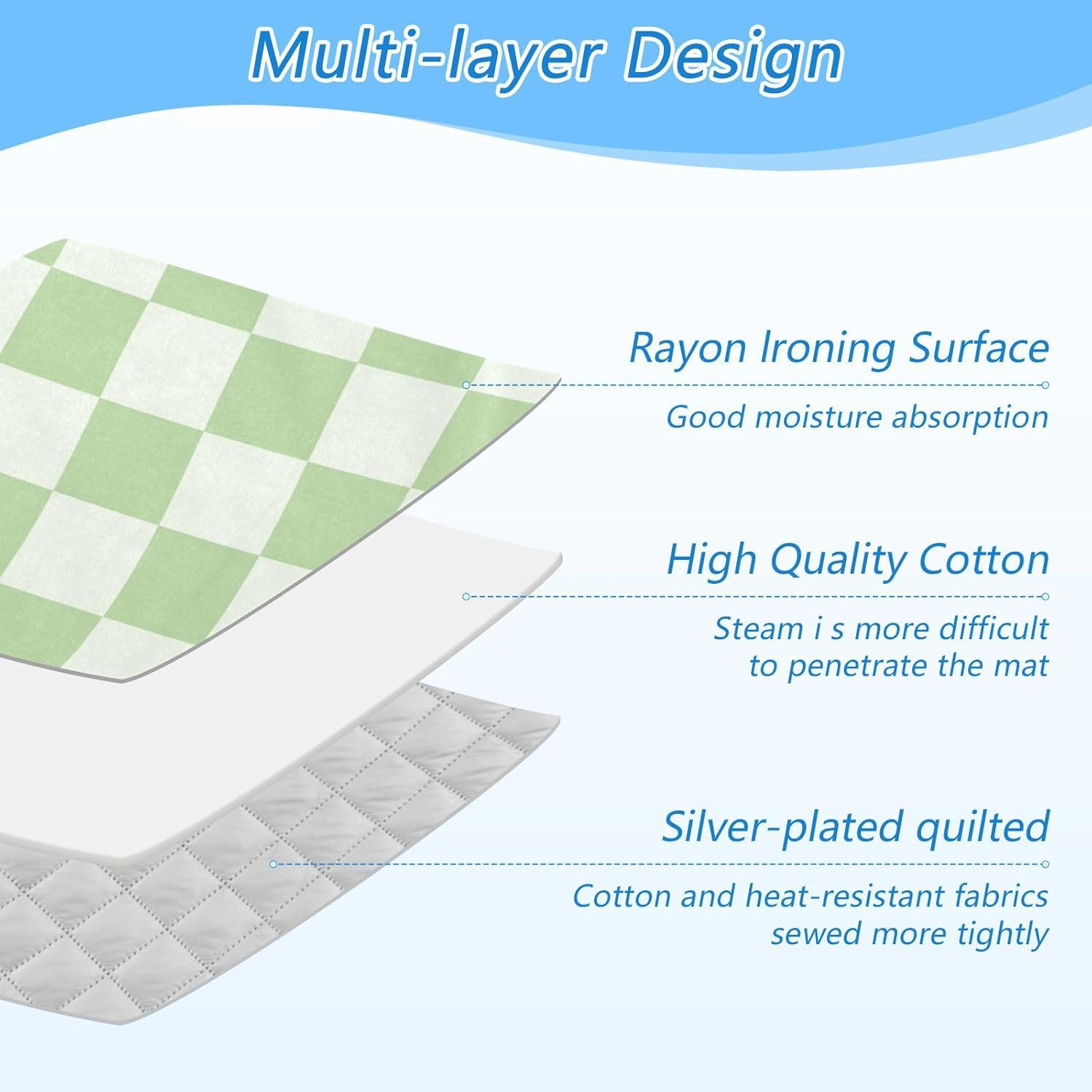 • High Quality:This ironing mat adopts a multi-layer design, with a surface made of Rayon lroning and good moisture absorption. High quality cotton in the middle makes it Steam more difficultto penetrate the mat. The bottom layer is coated with 210 silver-plated quilted, with cotton and heat-resistant fabricssewed more tightly. The ironing pad can be used on both sides, making it more durable