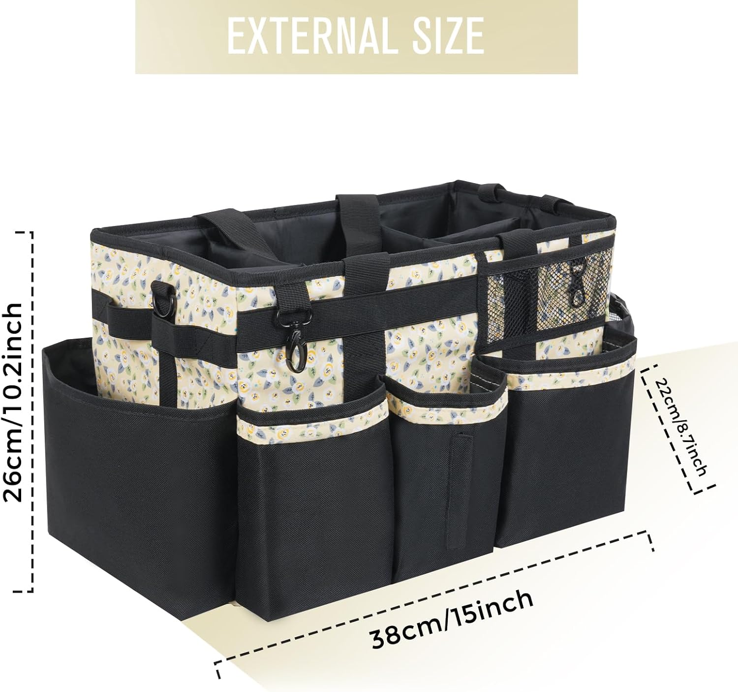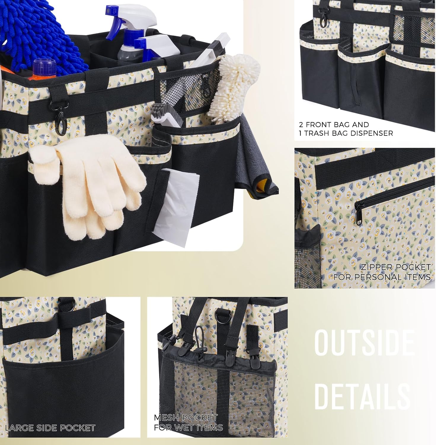 Wearable Cleaning Caddy, Cleaning Caddy Supplies Organizer with Handle & Shoulder Straps for Housekeepers, Under Sink & Car Cleaning Tool Organizers Bag with 4 Foldable Divider (YellowFlower)